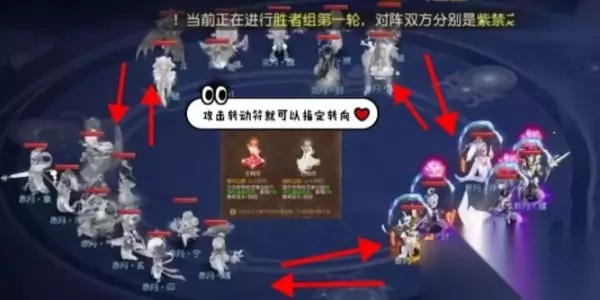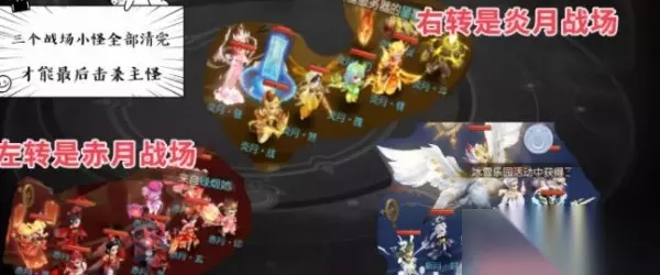 第三关首先要了解战场机制,不同于三生 兔和暗影龙,打完全部小怪后才切换到下一形态。女盼是3场战斗、3个战场可以随意切换(每当出现转动符,击杀即可向两边转动)。