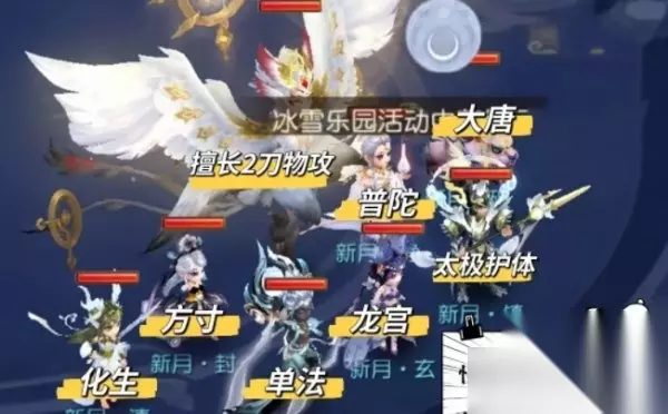 新月战场为入场战斗,8个怪物且伤害不高,但是战场特性小怪若气血小于25%,下回合会恢复至70%,所以新月战场适合叠状态,给队伍加好门派增益状态和特技。 优先击杀龙宫和大唐,减少血线上的压力。 新月战场适合恢复,不宜恋战状态起完可以进入赤月或者炎月战场。 二、炎月战场
