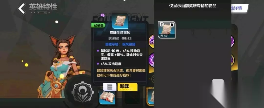 艾瑞卡的疾风追猎是她的一技能,在1级时即可解锁,该技能在释放后,会让艾瑞卡移动 6 米的距离,接着附加给艾瑞卡一个猫之矫捷的BUFF效果,持续时间是10秒钟,这个技能其实就是个BUFF技,没有什么攻击效果,但是能够让艾瑞卡的速度变得更快,灵活性更高,恰好艾瑞卡是一位依靠攻速来堆伤害的角色,所以还算是厉害的一个技能,毕竟它是其余技能的基础。 技能二是猫追不舍,13级的时候会解锁的一个技能,在猫之矫捷持续期间,可以提高自身连续攻击的几率,在移动2米后,可以为自己附加上追猎效果。