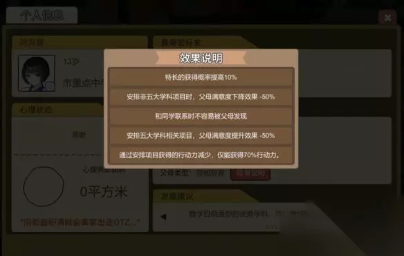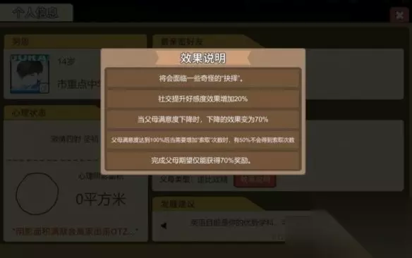 逗比戏精 为你早恋出谋划策的父母你喜欢吗?挺有意思的类型,会有额外“抉择”。负面效果是满意度满了只有一半概率给索取次数,但是另一条效果又降低了满意度下降。