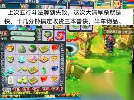 你们知道为什么很多五开玩家宁肯浪费时间,也要在那里等着抢五行斗法的怪物吗?主要是五行斗法任务给的奖励太好了,上面这位玩家的这组号完成了五行动法任务以后居然获得了半车的道具。 如果大家刷五行斗法的时候不要堵车,小编建议各位玩家凌晨再去刷,尤其是凌晨三四点的时候,那个时候的玩家数量最少。因为梦幻西游的玩家有一个特点,那就是他们可以熬夜,但是不能够早起,而且熬夜的梦幻玩家一般的情况下也就是熬到一两点。那些能够早起的玩家上线的时间段也在五六点左右,三四点的时候是没有人的。 乌鸡国给的敏法装备,有人说价值上千