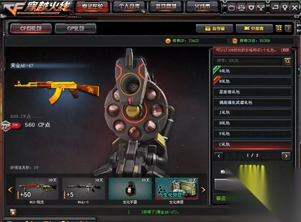 实际上在很多年前,CF就早已推出了抽奖活动,名为超值礼包,在游戏大厅页面个人仓库的左侧,分为A、B、C、D四大类型礼包,每个礼包内都有非常多的道具,其中有一些稀有角色和稀有武器,花费少量的CF点即可参与抽奖,依然是考验运气的时候,说不定就人品爆棚,一发入魂了呢。