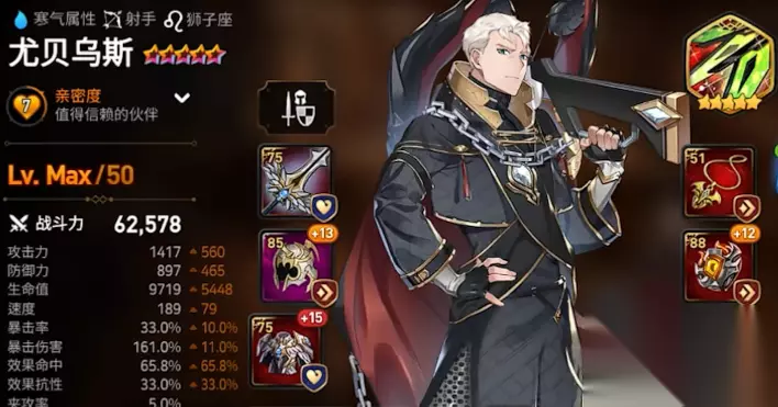角色本身有着持续的AOE伤害作为主力输出,而且整体技能CD偏短,并且附带的群体加攻能力。而且在队伍受到攻击的时候,还能额外触发S2,且自己本身就带了一定程度的减伤,可作为主力输出或者副手c位在队伍中进行搭配,表现相当不错。 2、尤贝乌斯 水弓箭手,强度算得上T1级别。毕竟在这个游戏当中,如果想打火讨伐战的话,就那么一定要练一个他。本身培养成本也较低。作为四星角色,在pve强度方面算得上T1顶尖级别,对龙13特化型角色。而且获取难度方面也很低,召唤时就能抽取,而且缘分任务还白送一个,是肯定要练的角色。
