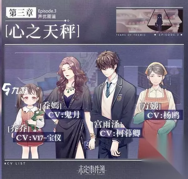 专属支线及思绪故事相关角色cv: 夏彦主线 刘医生cv:卞云鹏 张奶奶cv:魏思芸 左然支线 薛晓琳cv:翁媛 乐乐cv:v17-苏婉 院长cv:鹏小胖 莫弈支线 林芸芸cv:v17-KIYO 赫鲲鹏cv:曹真 陆景和支线 沈云巍cv:倪康 宋司瀚cv:黑石稔 夏彦-最佳拍档 姚晴cv:龟娘 林烨cv:孙晔 左然-心跳回忆 翟星cv:范楚绒 程澄cv:V17-筱筝 莫弈-咫尺远近 朱蔓cv:冯骏骅 陆景和-冤家路窄 迟少典cv:刘垚 以上就是未定事件簿声优表、主线案件支线及思绪故事cv一览,这些声优的加盟将为游戏添色不少。