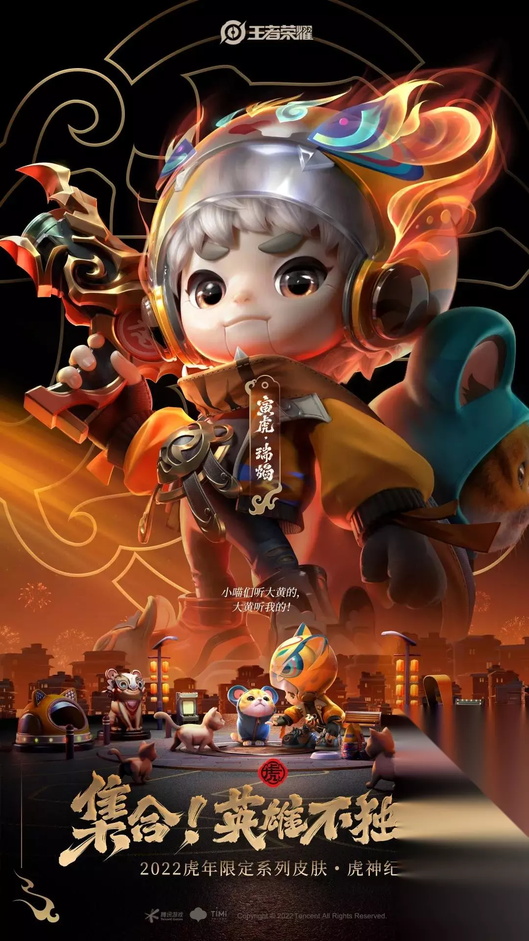 鲁班七号-寅虎·瑞焰 品质:限定传说 价格:1月31日-2月6日参与首周优惠价格是1430点券,2月6日之后恢复原价1788点券; 设计思路 头戴虎盔,手握虎枪,脚穿虎靴,穿着传统的复古服装,还融入了现代的皮革材料。 技艺以萱草黄为基调,以“烟花”为核心要素。被动的“萌虎”咆哮着,猛烈的火焰燃尽一切灾难。 一技能小虎神一跃而出;二技能小虎神腾云驾雾,勇往直前。 大招开始,小虎神坐镇圈中,一个个火球从口中喷出,烟花照亮了整个峡谷。
