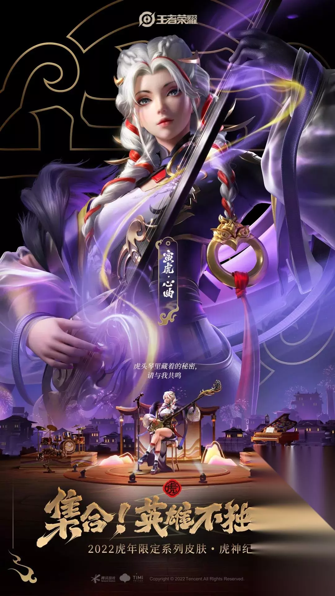 杨玉环-寅虎·心曲 品质:限定史诗 价格:1月31日-2月6日参与首周优惠价格是710点券,2月6日之后恢复原价888点券。 设计思路 同样以佛山铜凿剪纸为主题,以紫为基调的色调,给人一种冷艳的感觉。以旗袍为基础,搭配复古的腰封装饰和现代感的半透大衣款式。 毛领设计提取了虎纹,搭配了独臂的坎肩纹,采用非对称设计,腰带处的虎尾纹和胸前的虎头纹相连。一技能琴弦拨开,虎曲中的音符化作虎之灵咆哮而来; 两项技能剪出佛山铜剪纸风格的图案展开,一个关于老虎的故事娓娓道来;被三技的金色线条包裹着的复古演奏厅出现了,钢琴声达到高潮时,无数喝彩的烟花飞舞起来。