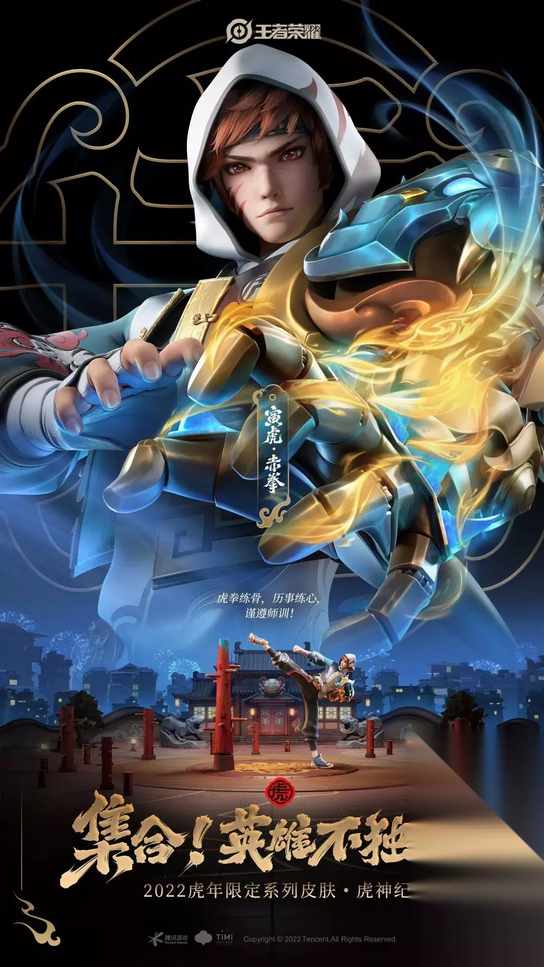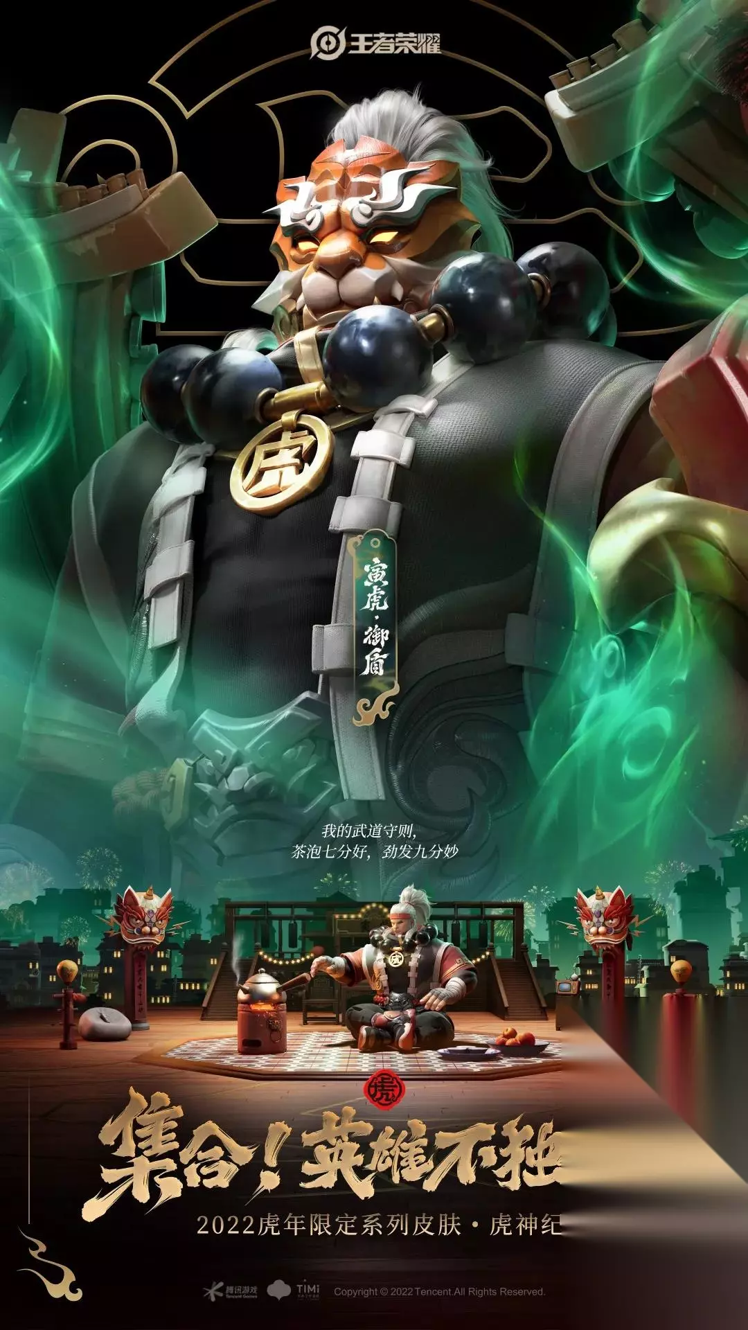 王者荣耀五款虎年限定皮肤汇总一览 廉颇-寅虎·御盾 品质:限定史诗 价格:1月31日-2月6日参与首周优惠价格是710点券,2月6日之后恢复原价888点券; 设计思路 使用了中国古代建筑的特色——青绿梁,以朱漆墙柱的青矾绿和朱红为基调。 头部神秘的老虎面具,与他内敛神秘的武术大师形象更为贴切,胸前神秘色彩的念珠则流露出传统韵味。 以青矾绿为基调,以虎门为主要设计元素。一技能举起千斤重的威严盾牌冲锋,蓝绿色虎头包裹; 二技能鞭炮倒计时,能量汇聚以青砖绿砖之势喷出;三技虎神之力加身,化为虎灵撼动大地。 地面用铜剪纸重叠的视觉,表现了平凡英雄齐心协力打败年兽的故事。