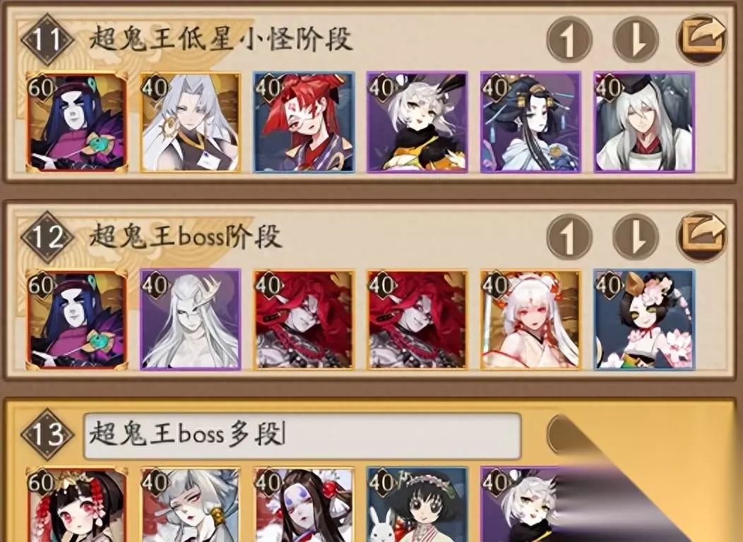 超鬼王各阶段如图上所显示,丑女改了ai不用担心乱插旗,有的超鬼王boss带特殊技能可能要更换其他式神,后面有提到的说。 辅助式神必备(即使这次你没有,下次活动之前你也要准备了。) 必须要有的:清姬 清姬 清姬 重要的内容说三遍 清姬已经属于必须要上的了且没有替代品 为什么 因为控制高的减防没她厉害 清姬的减防和多段攻击控制都不错 御魂方面 :最优雪幽魂土蜘蛛 速命生184+速 命中在100左右即可 不达标也没关系 也是可以用的 没有说速度不达标就不能用 小怪抵抗也一般