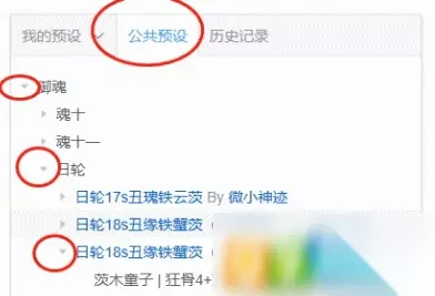 加载后,我们可以在左上角看到这样的内容,其中有“我的预设”、“公共预设”,如果不是大佬,只是单纯想使用一般的魂土、魂十、日轮之陨等副本的御魂组合的话,我们可以直接点击公共预设,这里有很多大佬分享的配置推荐。