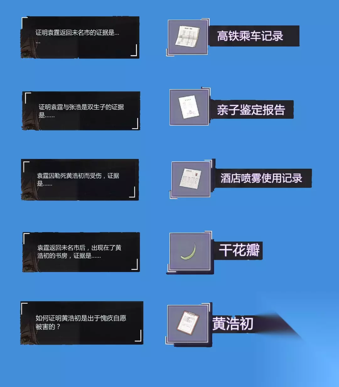 未定事件簿四章怎么过 出示证物的顺序: 1、高铁的乘车记录; 2、亲子鉴定报告; 3、酒店喷雾使用记录; 4、干花瓣; 5、黄浩初的检查报告。 大家依次出示下图的五个证物,就能够完美通关了。