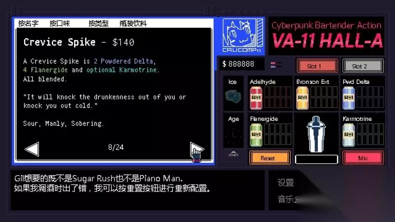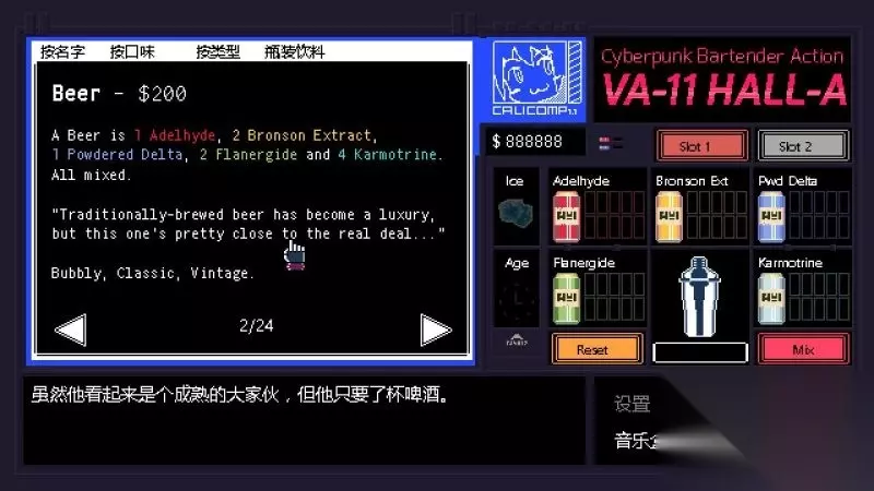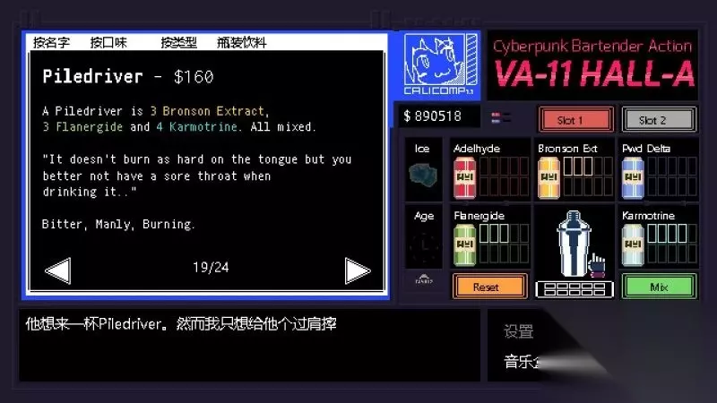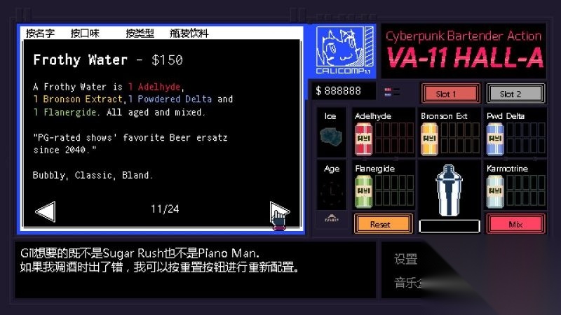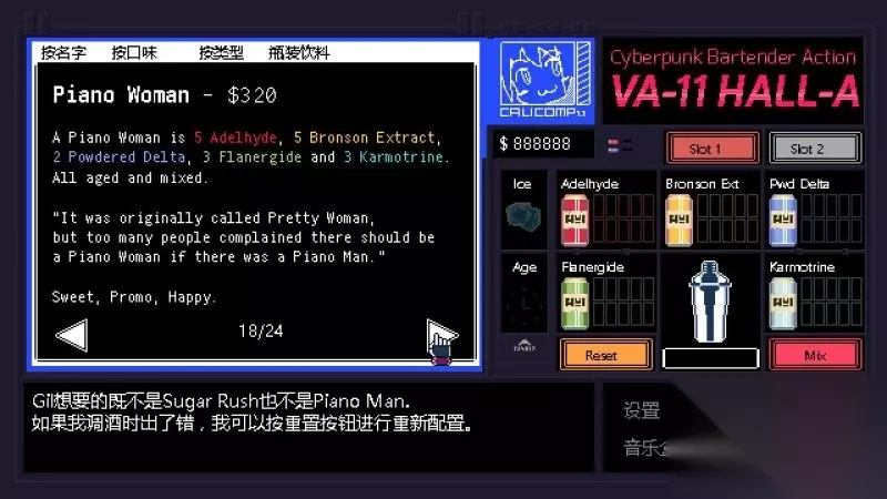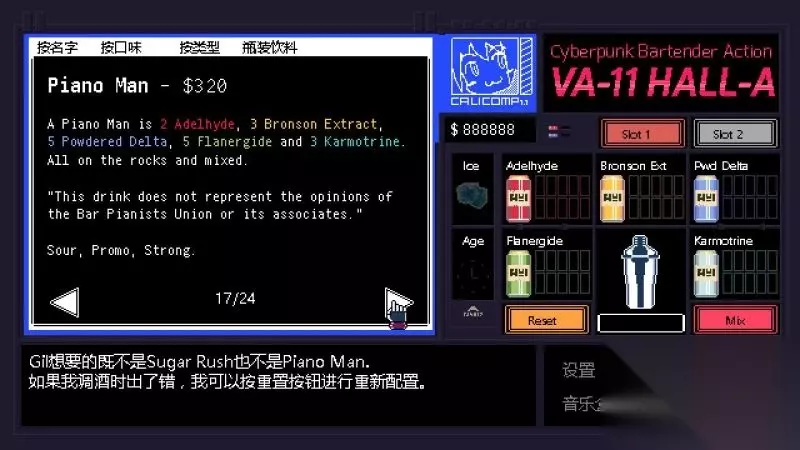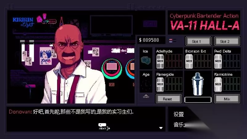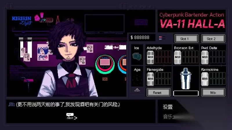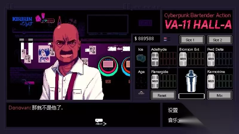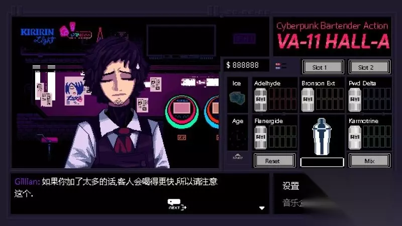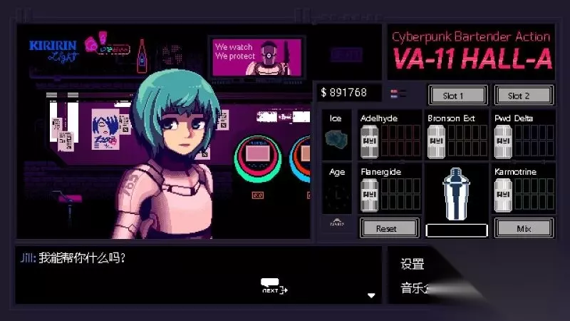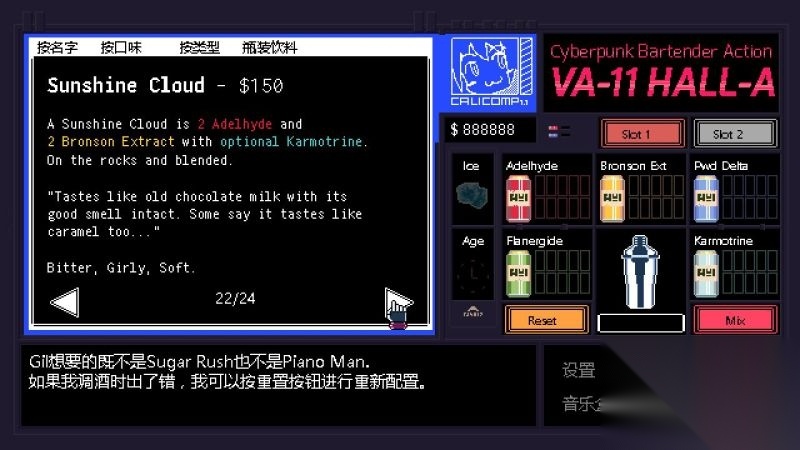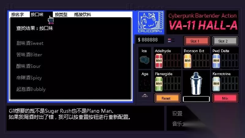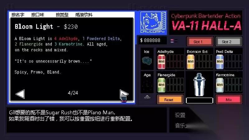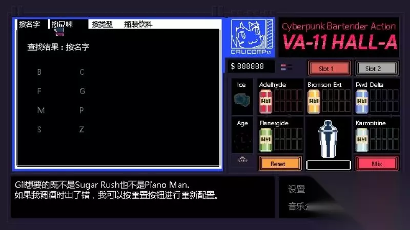酒吧界面(游戏主要界面) 人物框:在屏幕左侧出现的是酒吧的环境,主要对话人物会出现在这里。 留意他们身后的荧屏,上面会显示跟此人物对应的图案,它们会揭露其身份或者是与这些人物现在的心情有关。 对话框:屏幕左下角为对话框,对话内容会在这里出现,按鼠标左键可以继续对话。 调配框:屏幕右侧为调配框,当中会显示五种调酒材料(adaelhyde、bronson ext、pwd delta、flanergide、karmotrine)、两种添加物(冰块、age)、两个槽(1槽、2槽)以及两个操作键(重置和混合)。 特别注意操作键“混合”,初期混合是属于轻度摇晃,当5秒钟过后则会变成快速摇晃,某些饮品属于轻度摇晃的,则不能快速摇晃。 设置框:屏幕右下角为设置框,可以进行游戏设置、打开调整音乐的音乐盒、读取游戏(无法保存)、退出游戏返回主菜单。