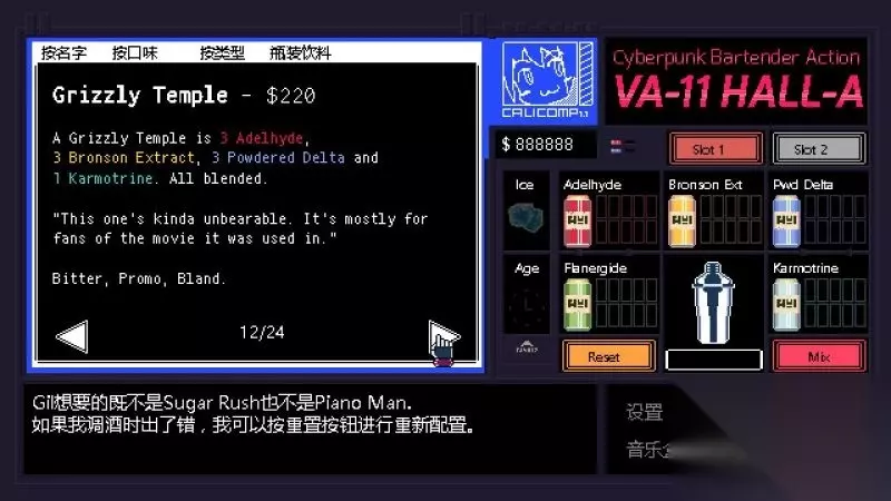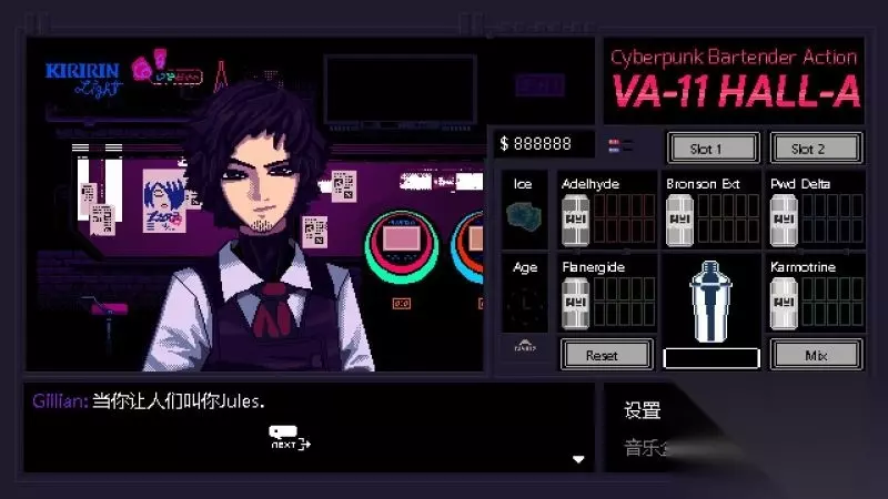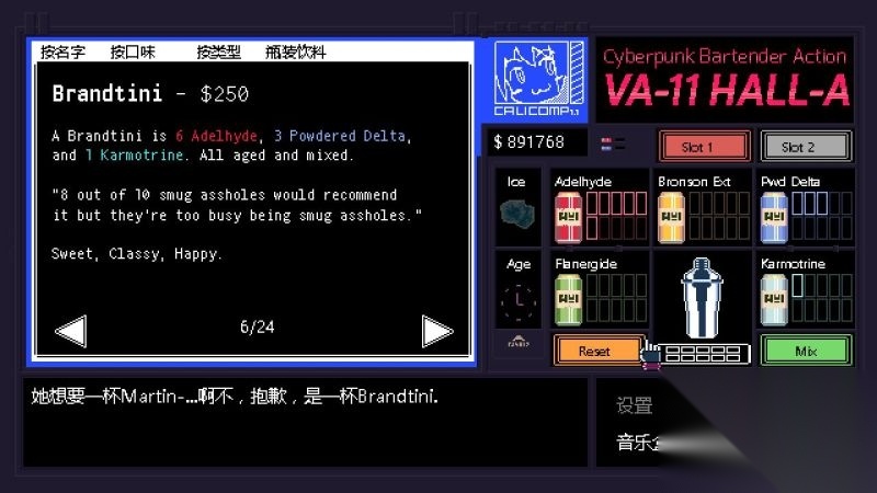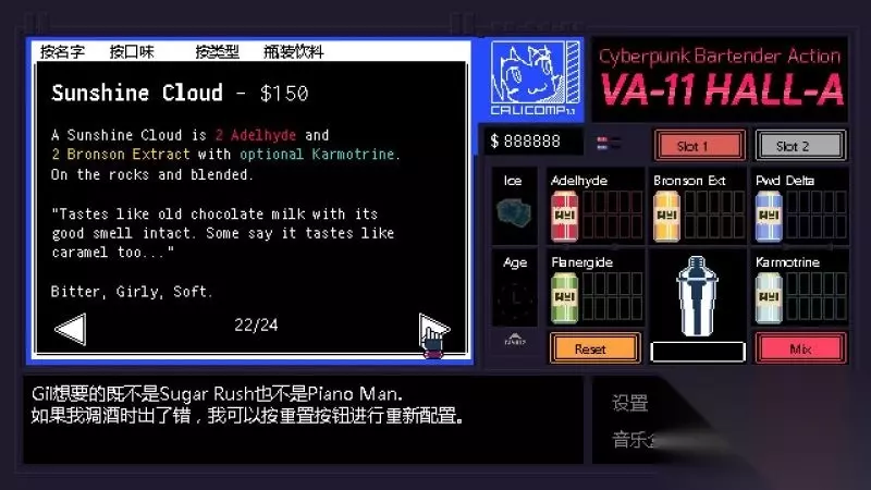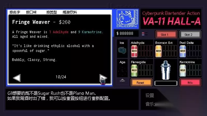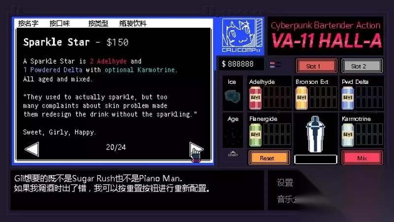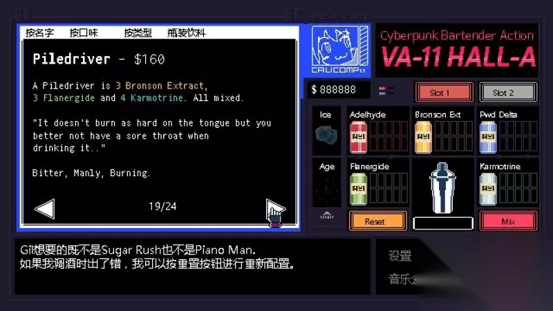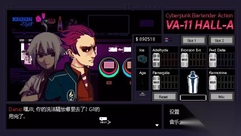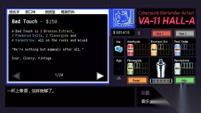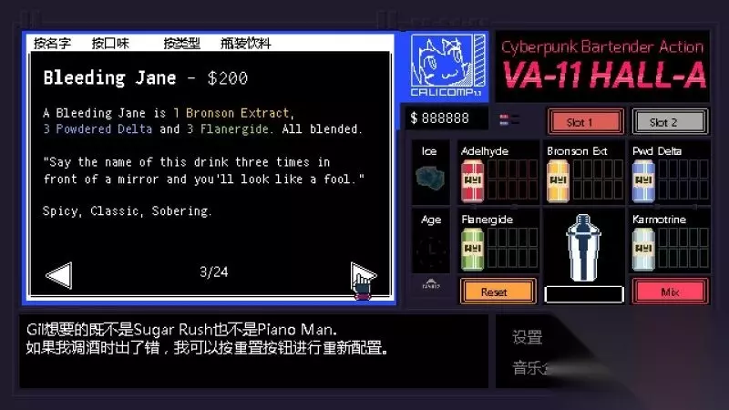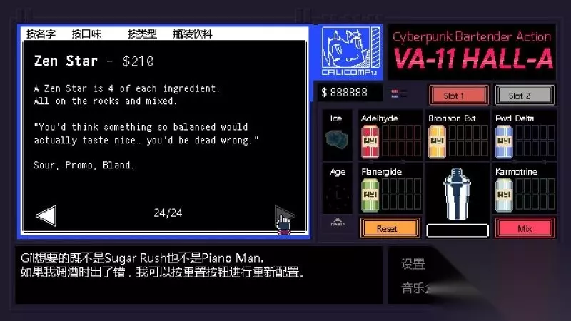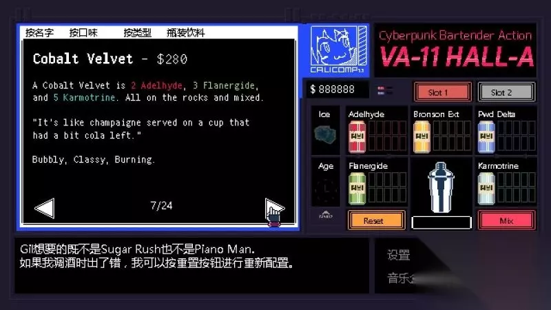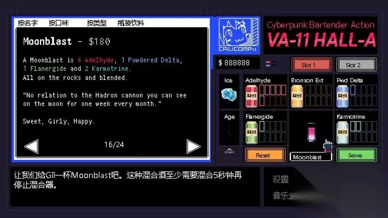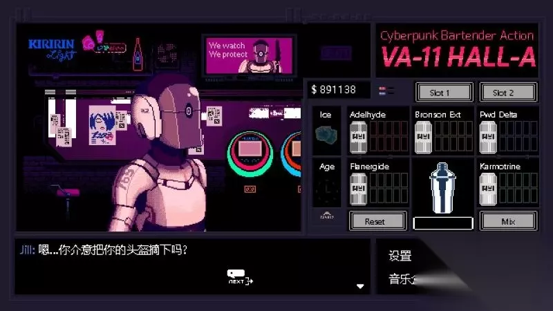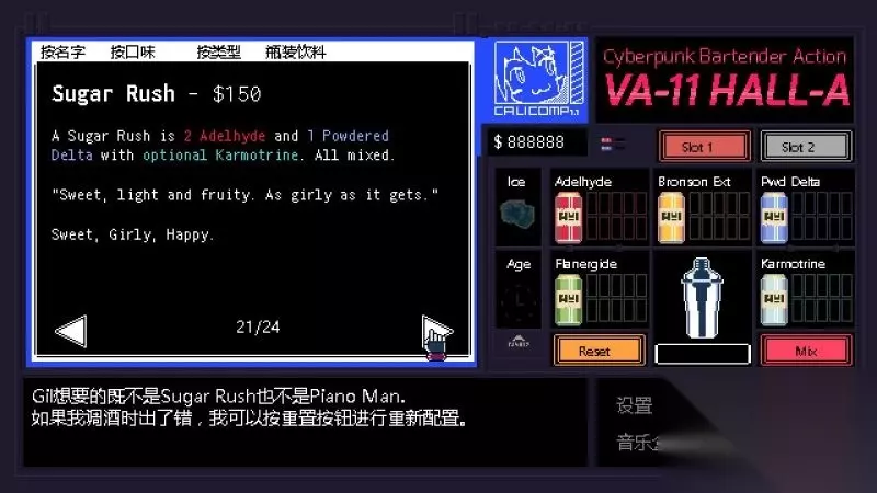 酒吧界面(游戏主要界面) 人物框:在屏幕左侧出现的是酒吧的环境,主要对话人物会出现在这里。 留意他们身后的荧屏,上面会显示跟此人物对应的图案,它们会揭露其身份或者是与这些人物现在的心情有关。 对话框:屏幕左下角为对话框,对话内容会在这里出现,按鼠标左键可以继续对话。 调配框:屏幕右侧为调配框,当中会显示五种调酒材料(adaelhyde、bronson ext、pwd delta、flanergide、karmotrine)、两种添加物(冰块、age)、两个槽(1槽、2槽)以及两个操作键(重置和混合)。 特别注意操作键“混合”,初期混合是属于轻度摇晃,当5秒钟过后则会变成快速摇晃,某些饮品属于轻度摇晃的,则不能快速摇晃。 设置框:屏幕右下角为设置框,可以进行游戏设置、打开调整音乐的音乐盒、读取游戏(无法保存)、退出游戏返回主菜单。
