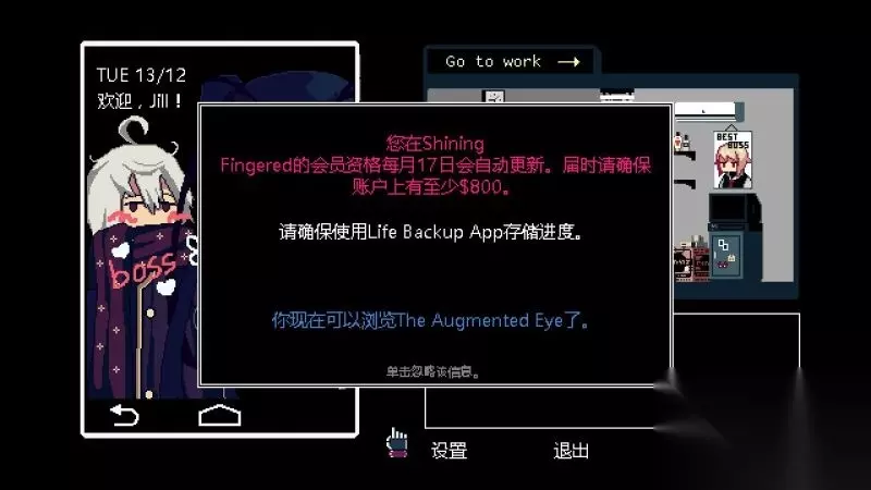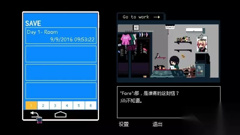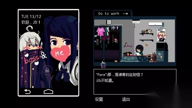家界面 手机:屏幕左侧为手机,在手机当中可以查看信息以及进行游戏保存或读取。 工作:屏幕右侧为工作,可以查看工作相关的信息,前往工作(度过一天),并且可以在商店购买道具(这里的钱指的是Jill自己的积蓄funds,而非酒吧营业的资金)。