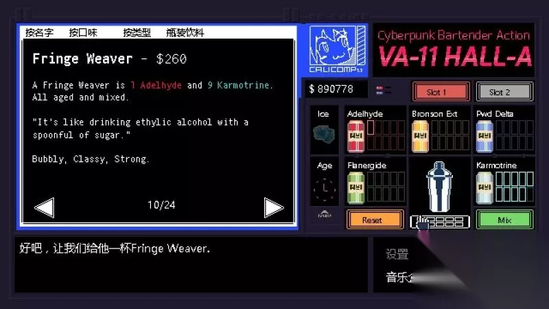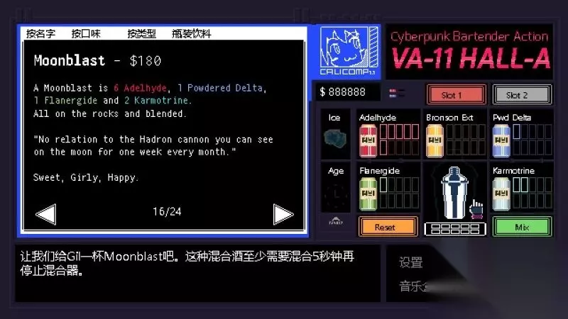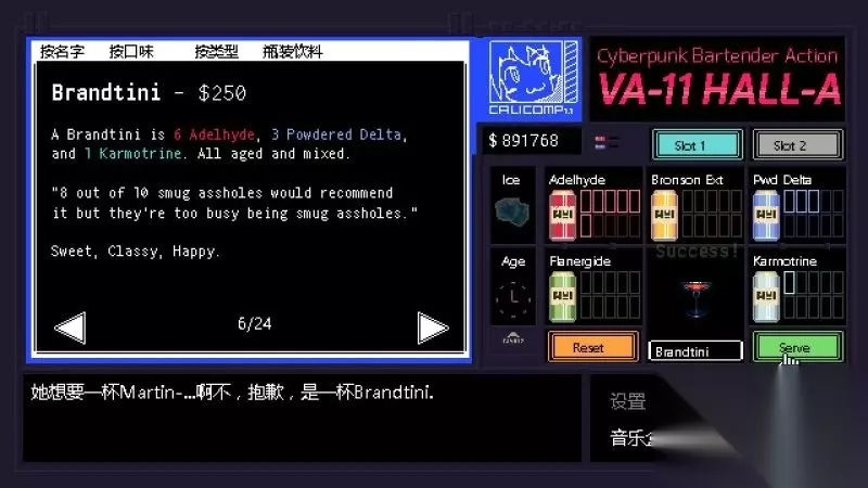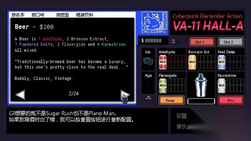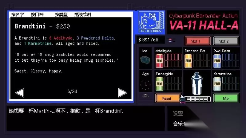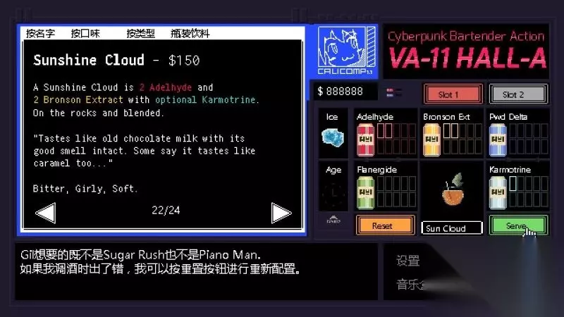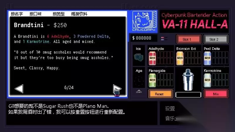 《赛博朋克酒保行动》是Sukeban Games制作的一款以文字玩法为主冒险解谜游戏。而你将能够成为一名酒保,游戏中扮演“VA-11 HALL-A”中的酒保角色,并且进行各种剧情的体验。今天小编给大家带来了《赛博朋克酒保行动》全调酒配方图文攻略,一起来看看吧。 界面操作 移动鼠标:选择; 鼠标左键:确定; 返回按钮:后退;