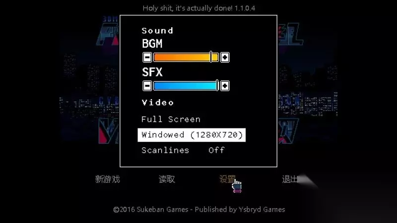 设置菜单 声音BGM:调整背景音乐的大小; 声音SFX:调整环境音效的大小; 视频全屏:选择窗口模式或全屏播放以及调整分辨率; 扫描线:开启或关闭扫描线效果;