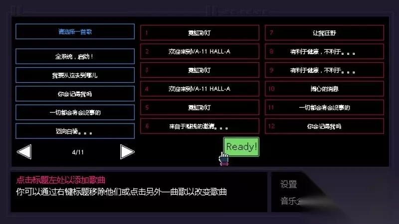 添加歌曲 酒吧内的歌曲由玩家去安排,目录一共有12个位置,玩家可以安排12首歌,然后点击“准备”按钮即可。
