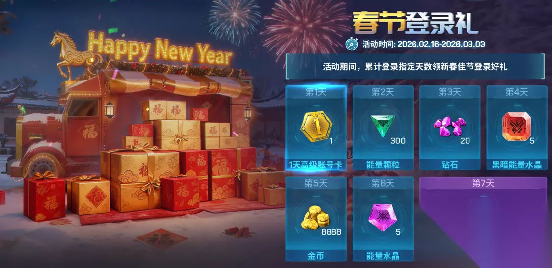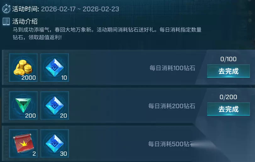1、每日消耗100钻石,领取金币*2000,能量碎片*10 2、每日消耗200钻石,领取能量颗粒*200,能量碎片*20 3、每日消耗500钻石,领取低级伤害卡*2,能量碎片*30 4、每日消耗1200钻石,领取能量水晶*40,能量碎片*50 5、每日消耗2500钻石,领取黑暗能量水晶*20,能量碎片*100 金蛇迎春好运齐分享 一马当先纳千祥,万马奔腾庆团圆。春节赶紧邀请小伙伴一起在蓝天中驰骋吧!每日分享一次可获得幸运钥匙*2 福利暴击