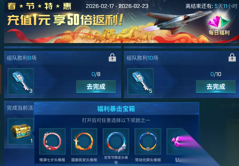 1元开启福利暴击,完成所有任务后可领取福利暴击宝箱,打开宝箱有限定头像框或钻石可供选择。 春节派对限时充值返利