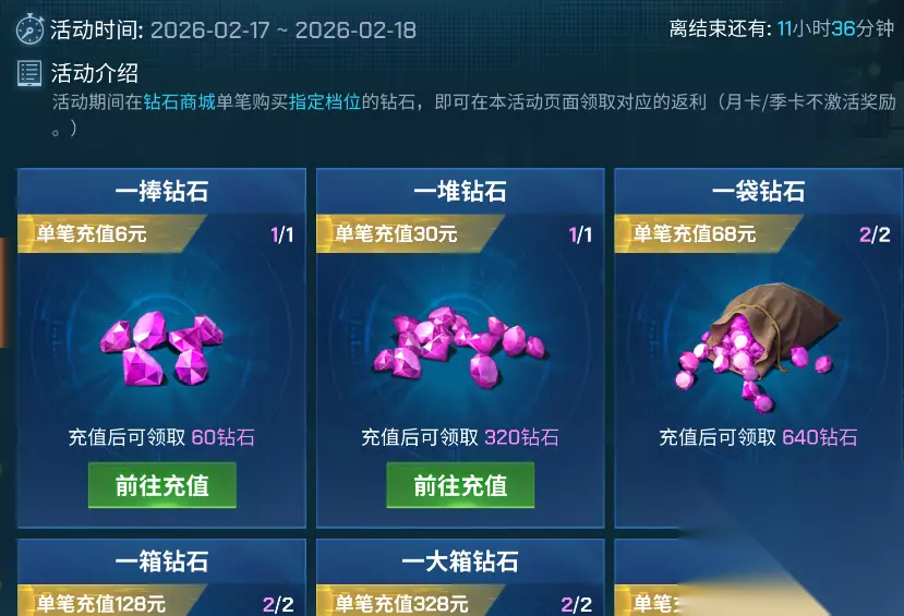 活动时间:2026-2-17 00:00:00~2026-2-18 23:59:59 活动期间在钻石商城单笔购买指定档位的钻石,即可在本活动页面领取对应的返利(月卡/季卡不激活奖励) 1、单笔充值6元钻石礼包,领取钻石*60,(奖励限制次数:1次) 2、单笔充值30元钻石礼包,领取钻石*320,(奖励限制次数:1次) 3、单笔充值68元钻石礼包,领取钻石*640,(奖励限制次数:2次) 4、单笔充值128元钻石礼包,领取钻石*1200,(奖励限制次数:2次) 5、单笔充值328元钻石礼包,领取钻石*2500,(奖励限制次数:2次) 6、单笔充值648元钻石礼包,领取钻石*6000,(奖励限制次数:2次) 春节回馈传奇宝箱折扣 春节限时活动,传奇宝箱8折回馈 神秘商店 活动时间:2026-2-17 00:00:00~2026-2-18 23:59:59 春节神秘商店全场一折起 春节尊享限时双倍掉落 亲爱的飞行员,2月17日2月23日 19:00-20:00期间,排位/活动模式享受双倍金币、经验、能量颗粒、能量水晶掉落。注意:加成卡/高级账号等额外加成不翻倍,祝各位飞行员飞行愉快 春节礼包 12元春节团圆礼包: 能量水晶颗粒*1200,能量水晶碎片*250,低级装甲卡*2 68元春节优惠礼包: 能量水晶颗粒*5000,能量水晶*120,低级装甲卡*10 128元春节惊喜礼包: 能量水晶碎片*1200,能量水晶*240,中级伤害卡*6 198元御天敌涂装礼包: J-20御天敌涂装*1 258元天弩战机特惠礼包: JC-20 天弩*1 648元天弩战机礼包:JC-20 天弩*1,钻石*7500,金币*200000,能量水晶*400 648元御天敌战机涂装组合包: 钻石*5000, FA-Y25御天敌*1,FA-Y25御天敌涂装*1 以上就是本期的全部内容啦 在这个万马奔腾的春节里 让我们驾驭战机直冲云霄 追逐新年的第一缕阳光! 活动详情已悉数呈现 赶快加足马力一同驰骋这场热血空战盛宴吧! 愿您在新的一年里 每一场战斗都能马到成功!