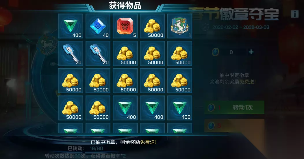 随着转动次数增加,幸运值正在疯狂累积!当你转动满 30 次,徽章概率 ×2;满40 次,概率 ×4;满50 次,概率 ×8!每一次转动,都是在为解锁终极徽章蓄力! 新年好运连连,快来转动轮盘,赢取徽章与全部奖励,开启属于您的新春夺宝之旅! 奖品展示 转盘内的奖品种类繁多。其中,顶级徽章“骏马腾飞”最为瞩目。