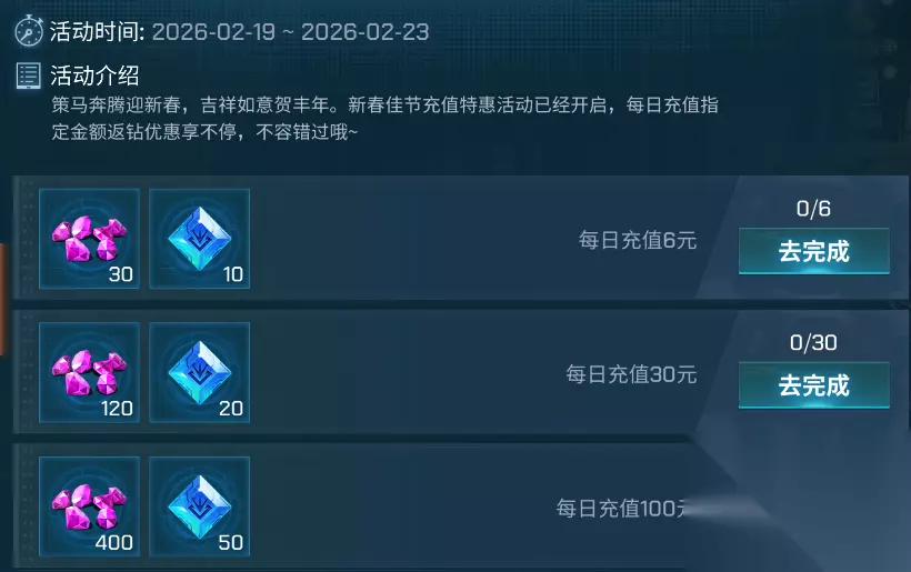 策马奔腾迎新春,吉祥如意贺丰年。新春佳节充值特惠活动已经开启,每日充值指定金额返钻优惠享不停,不容错过哦~ 1、每日充值6元,领取钻石*30,能量水晶碎片*10 2、每日充值30元,领取钻石*120,能量水晶碎片*20 3、每日充值100元,领取钻石*400,能量水晶碎片*50 4、每日充值300元,领取钻石*1500,能量水晶碎片*100 5、每日充值600元,领取钻石*3000,能量水晶碎片*200 新春消费一起过福年 马到成功添福气,春回大地万象新。活动期间消耗钻石送好礼。每日消耗指定数量钻石,领取超值返利!