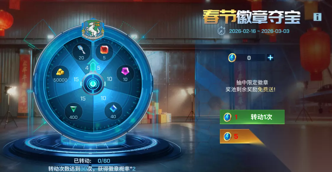 在爆竹声中,我们为全体飞行员送上专属感谢福利,飞行员们在2 月 17 日至 3 月 3 日期间登录游戏即可领取。感谢飞行员们一路相伴,祝愿大家在新的一年里,在游戏中飞得更高更远,在现实生活中万事顺心、心想事成。 徽章夺宝 活动时间: 2月16~3月3日 指挥官们,新春狂欢加码!「徽章夺宝」活动震撼上线,7 大神秘奖池区域,60 份丰厚奖励等您探索!