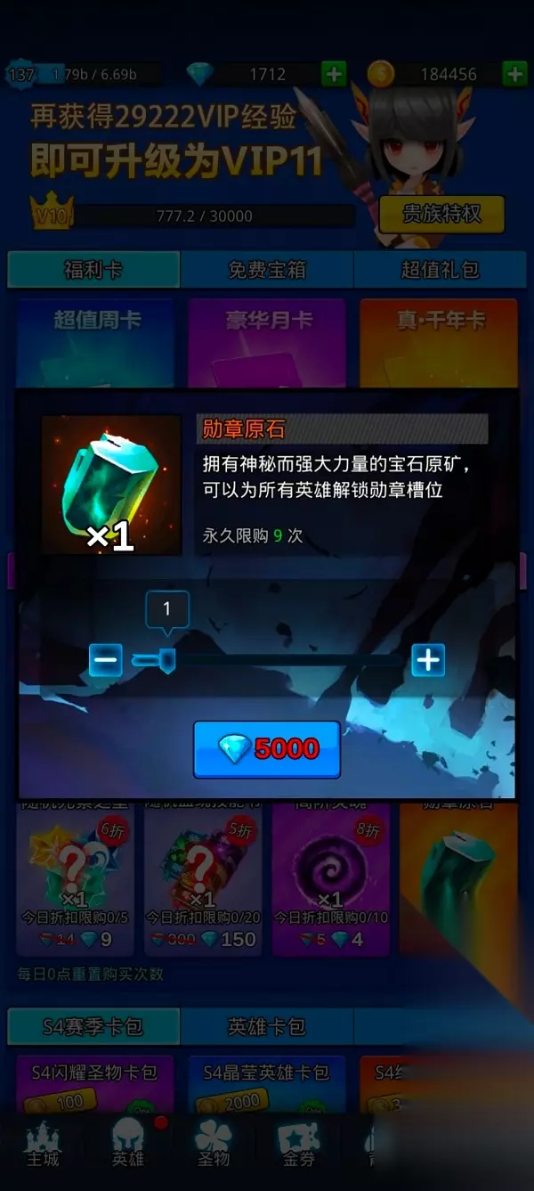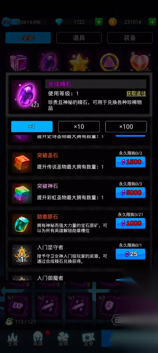 合成晶石可兑换的奖励很多,不过前期推荐的只有一千晶石一个的勋章原石,用来解锁英雄的勋章位置。可以较大的提升我们的战斗力。用钻石购买的话是五千一个,用晶石的话通过试炼以及基础无限女神推图获得。每日通过试炼可以用以三钻一晶石的比例获得,相比于钻石直接购买会实惠很多。并且还可以额外获得大量的经验奖励。vip经验也是比较推荐的,毕竟等级越高好处越多。