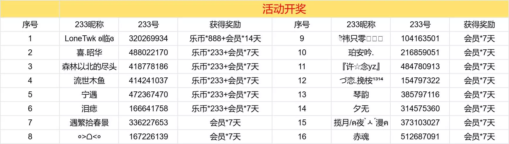 随机抽取10位冒险家获得233会员*7天