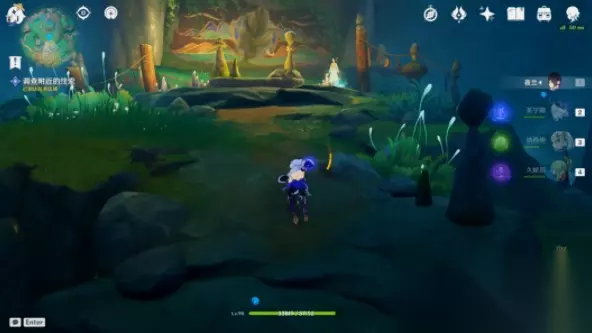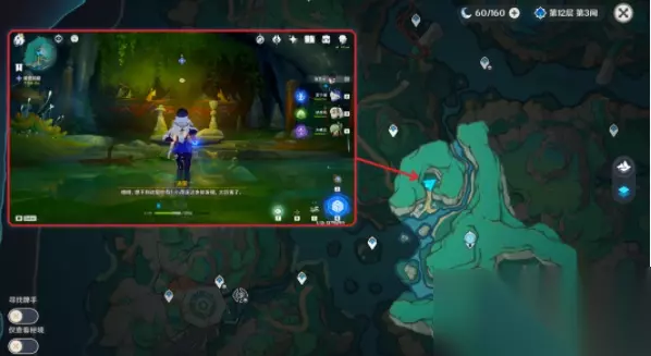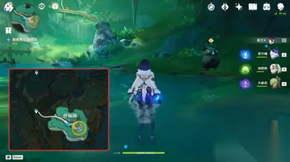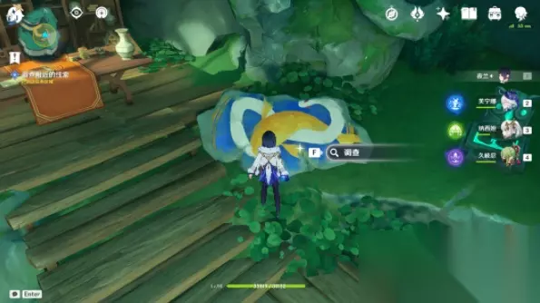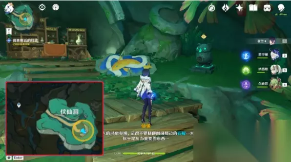 7、完成之后与浮锦对话,玩家要前往伏仙洞,在这里解决周围的氲气,再去调查附近的线索: (1)在伏仙洞的入口附近找到这个「慢悠悠仙像」,按T将其收起