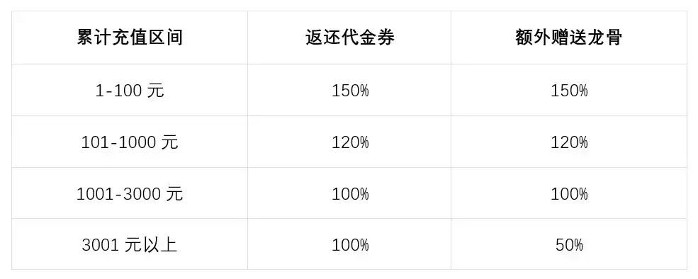 ※充值金额大于100元时,各区间的返还将累计计算。