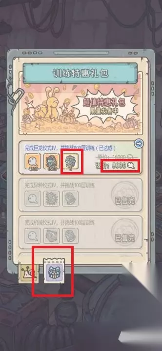4、打开训练回馈礼包,当玩家完成巨龙五阶仪式之后,就可以用8000白蝌蚪购买礼包,礼包包含4800白蝌蚪,1500个宝箱,以及5个巨龙基因片段。