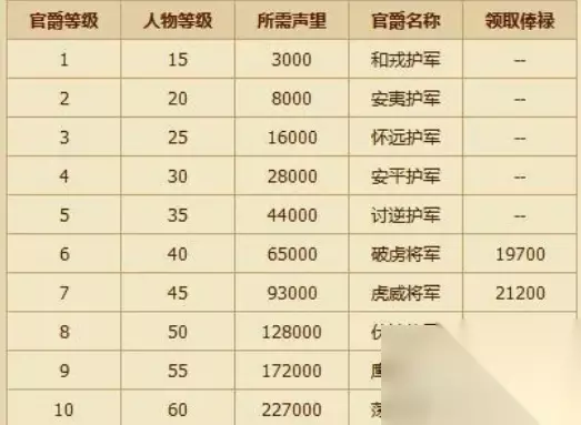 QQ三国的官爵排名图文一览 排名一览: 官爵等级:1-人物等级:15-所需声望:3000-官爵名称:和戎护军-领取俸禄:0 官爵等级:2-人物等级:20-所需声望:8000-官爵名称:安夷护军-领取俸禄:0 官爵等级:3-人物等级:25-所需声望:16000-官爵名称:怀远护军-领取俸禄:0 官爵等级:4-人物等级:30-所需声望:28000-官爵名称:讨逆护军-领取俸禄:0 官爵等级:5-人物等级:35-所需声望:44000-官爵名称:安平护军-领取俸禄:0 官爵等级:6-人物等级:40-所需声望:65000-官爵名称:破虏将军-领取俸禄:19700 官爵等级:7-人物等级:45-所需声望:93000-官爵名称:虎威将军-领取俸禄:21200 官爵等级:8-人物等级:50-所需声望:128000-官爵名称:伏波将军-领取俸禄:24800 官爵等级:9-人物等级:55-所需声望:172000-官爵名称:鹰扬将军-领取俸禄:30300 官爵等级:10-人物等级:60-所需声望:227000-官爵名称:荡寇将军-领取俸禄:37700