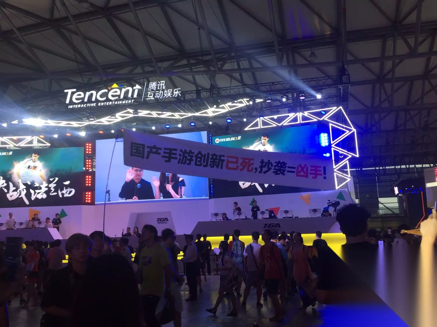 当时腾讯的态度是,喊了会场的保安,维护现场的持续,将举牌的人全部轰走了,事情最后也不了了之了。 仅过了一天,《王者荣耀》就举行本次Chinajoy上激情四溢的女子战队表演赛,丝毫没受前天“被撕”的影响。 下面,我们来看看表演赛现场的情况:在女子战队表演赛中,新英雄“雅典娜”首度亮相,让这位本应该在八月份才与玩家见面的英雄成为了万众瞩目的焦点!