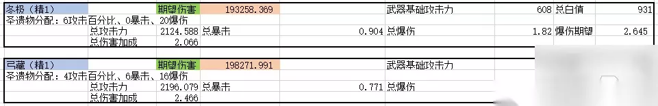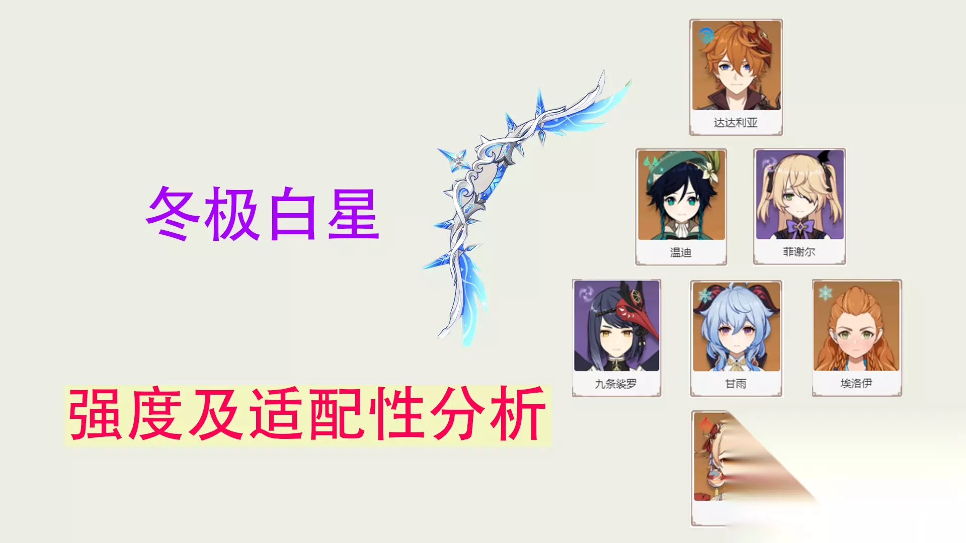 可见冬极对副C温迪的提升也还是挺大的,为伤害最高的选择。偏辅助出装的话,则是终末嗟叹之时好些。 【皇女】 皇女和温迪有点类似,目前主流玩法还是以后台副C为主。E技能和Q技能召唤的奥兹的伤害都视为E技能伤害,故皇女的伤害也基本都是技能伤害,是可以吃到冬极被动的加成的。不过皇女的Q技能一般是用来衔接奥兹的持续时间的,不会EQ同时用;蓄力重击也需要一定的时间,故一般也就能保持2-3层被动。冬极对皇女的提升,也是在天空之翼和绝弦之上的。 【九条】 九条是一个很强力的增伤角色,Q技能有着不错的伤害倍率,10级Q就有近1000%的倍率,所以也是有一定的副C能力的。20级突破天赋的存在,使得九条开E之后的瞄准蓄力时间减少60%,对快速叠满冬极被动有所帮助,故冬极与九条的适配性也还算不错。 九条给队友的增伤能力来源于自身的基础攻击力,90级冬极的基础攻击力为608,而90级天空之翼有674,为目前弓箭武器里最高的。因此对于九条,还是天空之翼更好一些,冬极次之。 下面是几位适配性不是很好的 【甘雨】 冬极对于甘雨的适配性还是比较尴尬的。目前甘雨的主流玩法有两种:乐团融化流和冰套永冻流。 对于融化流,甘雨一般是不会轻易使用大招的,因为二段蓄力箭的两段伤害是单独挂冰的,大招是很容易抢反应的,故想满层被动有点困难。其次,甘雨的主要伤害来源还是靠蓄力重击,冬极的被动并不能得到充分的利用,所以基本可以认为只吃到30%的攻击百分比加成。融化流的阵容是有班尼特和双火元素共鸣存在,冬极被动的加成收益还会被进一步稀释。 对于永冻流,虽然大招可以得到充分的利用,且能轻易吃满冬极的被动。但问题在于冬极副属性就有33.1%的暴击率,加上突破天赋的20%,冰套上限的40%,以及自带的5%,就已经接近100%暴击率了。这意味着圣遗物副属性的暴击率将基本没有提升。而圣遗物若不选择含有副属性含有暴击率的,那有效词条数必将受限,怎么想都不值。所以永冻流甘雨带冬极的话,圣遗物反而是2+2更好。 【埃洛伊】 埃洛伊的普攻伤害并不优秀,40能量的高倍率大招是亮点。埃洛伊对冬极的适配性还算不错,就是角色定位有点尴尬。作为主C的输出能力并不优秀;作为靠大招输出的副C的话,功能性又略显不足。 【宵宫】 不过最尴尬的还是宵宫。开E的附魔攻击是属于普通攻击,E技能并没有伤害,这就意味着宵宫最多只能吃到3层冬极的被动。目前宵宫的主流圣遗物还是追忆4件套,这就意味着大招的使用率将会大大降低,所以很长时间内又得少一层被动。此外,宵宫的伤害来源基本都是普攻,冬极的那个技能伤害加成的被动基本无用。仅靠武器的面板值和两层被动的20%攻击百分比,伤害能力甚至是比不过精1弓藏的。