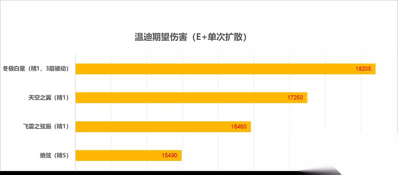尽管考虑到了班尼特和双火的攻击力加成,冬极作为公子专武的优势依旧在,精1冬极比精1天空高10%左右的伤害。但与飞雷的差距并不大,因为公子有一半以上的伤害来源于普攻,飞雷对普攻伤害的加成能力还是很强的。因此对于有飞雷的玩家,其实是没必要抽冬极的,除非打算宵宫和公子一人一把。对于其他没有飞雷的强度党,以及公子真爱玩家,当然可以考虑抽冬极。不仅是伤害更高,外观也搭。 【温迪】 副C温迪主要是靠EQ技能打伤害,Q技能有较长的持续时间,且温迪的元素充能效率一般都不会低。温迪带冬极的话,基本是可以常驻3层被动的(因为一般也不使用重击,但使用技能前顺手A一下还是简单的)。所以温迪也是很适配冬极的,是目前输出副C温迪的最佳武器。 以下仅对比部分武器对于温迪E技能伤害(点按)+单次扩散伤害(圣遗物风套4,属性攻、风、暴,有效伤害词条为20) 参与对比的武器:冬极白星、飞雷之弦振、天空之翼、绝弦