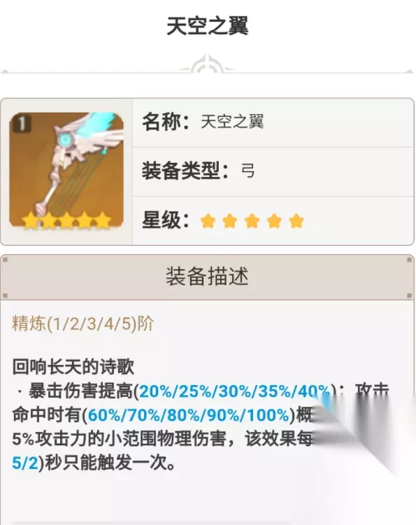 (精5的数据为:EQ技能增伤24%,满层时攻击力提高96%) 2.泛用性分析——横向对比天空之翼 天空之翼的伤害上限并不算高,因为被动仅20%的爆伤加成以及还有一个加成并不大的范围物伤。但凭借着高基础攻击力、高贵的双暴属性的优势,一直都是弓箭里泛用性最高的存在。本次UP的冬极也有着不错的泛用性,副属性高达33.1%的暴击率,极大的缓解了圣遗物的压力;被动的EQ增伤适用于很多弓箭角色,攻击百分比加成也是通用的。按照资源权重的46.6%的攻击百分比对应66.2%的暴击伤害,冬极在2层被动的时候就已经超出天空弓的强度了。当然实际攻击力的稀释来的快,差距不会太大。 但有一说一啊,冬极对于当前的弓箭主C角色,宵宫和甘雨的适配性不是很高;正常能吃满被动的也就公子,其他角色想要吃满多少有点麻烦。因此冬极也是有一定的不足之处的。更多具体的层数问题和各武器伤害差距在后面的适配角色里会说明。
