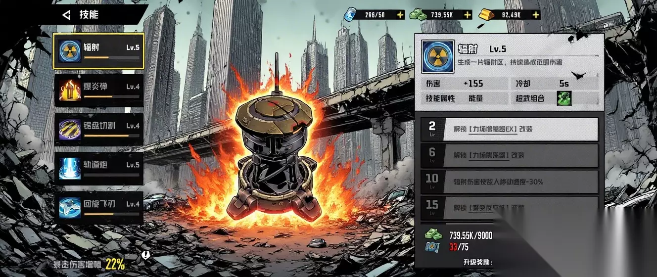 主动技能满级30级。每次升级都能提高主动技能的伤害;主动技能升级到2级,6级,10级,15级,20级,25级这6个等级节点的时候会解锁相应的武器改装或者特殊增益效果加成。 这边用技能辐射来举例: 武器改装: 2级:解锁【力场增幅器EX】改装可以使辐射的范围+20% 6级:解锁【力场震荡器】改装可以使超武辐射的节奏力场伤害频率+20% 15级:解锁【聚变反应堆】改装可以使辐射伤害+50% 特殊增益效果: 10级:辐射伤害使敌人移动速度-30% 20级:辐射伤害使敌人在2s内受到伤害+15% 25级:辐射范围内死亡的怪物无法自爆或分裂 增益加成效果在玩家局内对战升级时选择相对应的主动技能就会生效,而武器改装则要玩家在对局内手动选择相对应的武器改装效果才会生效。 除此以外,技能还可以搭配相关核心使用,如辐射技能可以搭配的核心有以下两个,一个可以减少超武形态音波冲击的技能冷却时间,一个可以通过缩小辐射范围增加辐射技能伤害等。