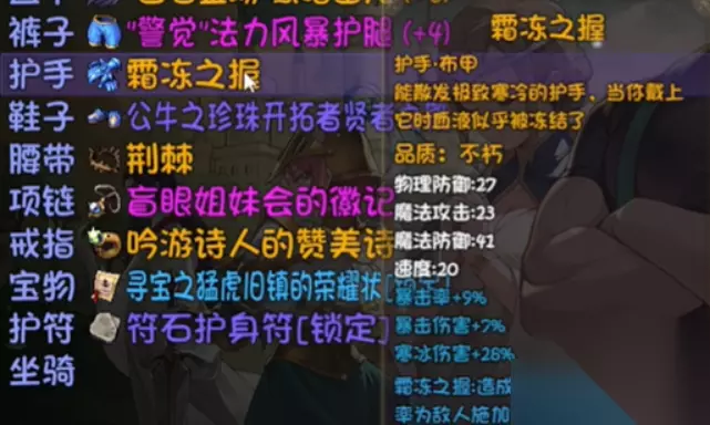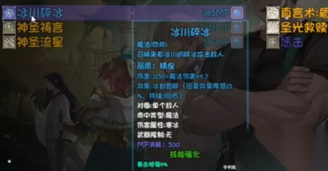 另外比较重要的就是对于装备的选择,之所以让玩家选择霜冻之握和冰川碎冰,主要是因为霜冻之握是一个能带来4点加成的护手,带上之后血液就几乎被冻结了,能提升207点的物理防御,23点的魔法攻击,最重要的是能带来四12点的魔法防御,这就表示在对战的过程中,暴击率,暴击伤害都能增加,另外寒冰伤害也能增加26%,在造成伤害的时候有50%的几率产生冰冻效果,可以很好的制衡对手。 另外学习冰川碎冰这个技能,就是因为这个技能能带来大量的魔法伤害,同时能持续三个回合冰封血脉,此后在对战过程中,如果想要攻击单个的对手,那么也可以借助这个技能去强化自身,假如现在没有的话,就可以去魔法师那里购买。