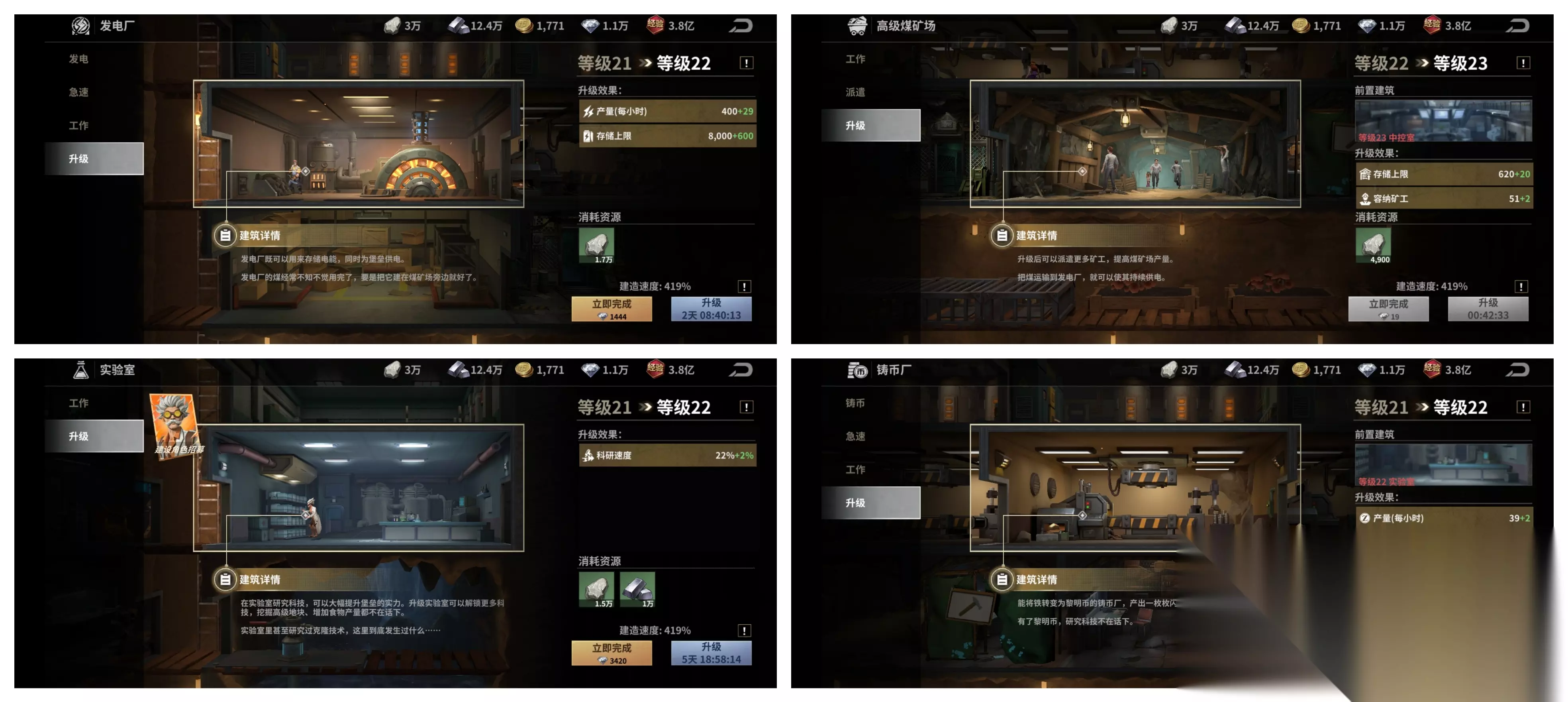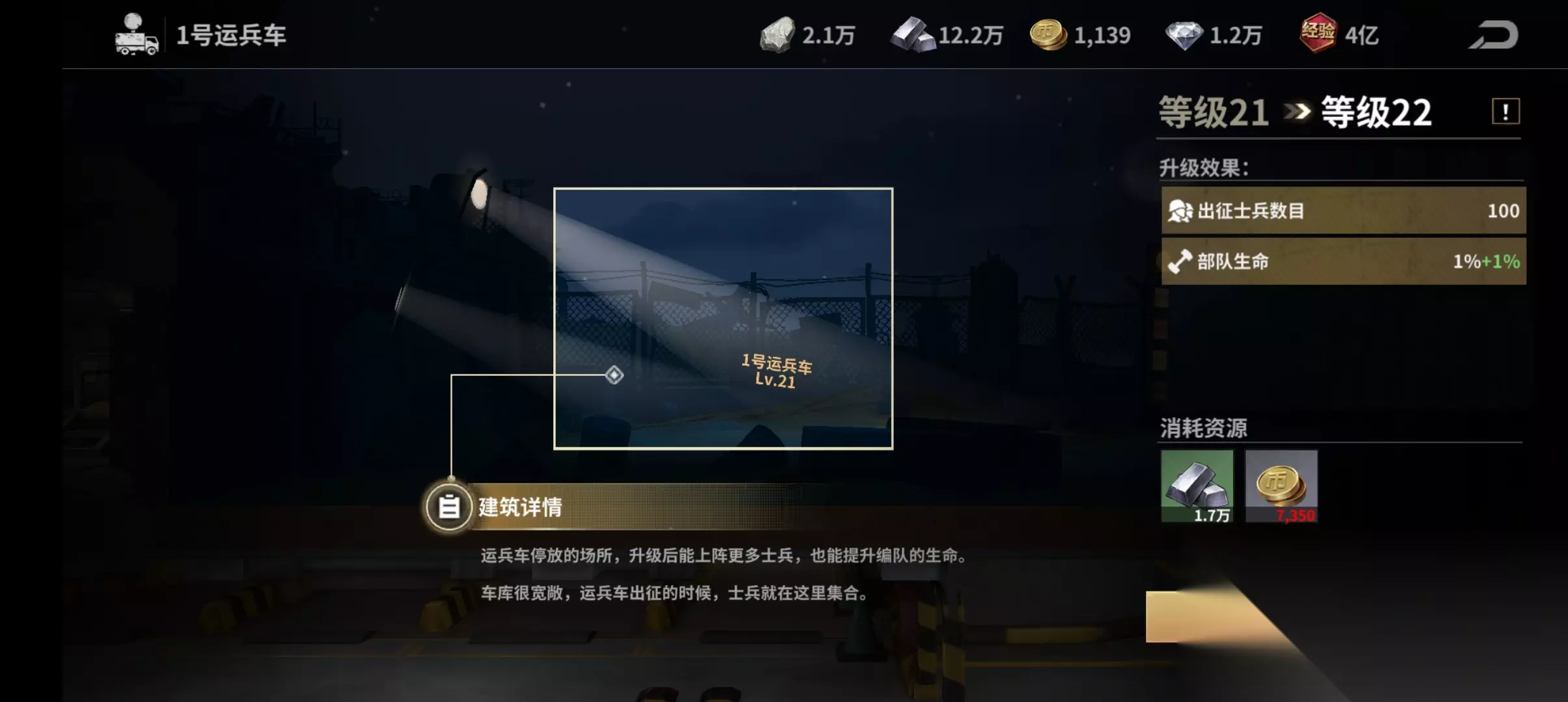 铸币厂是铸造废土币的,很多地方都要用到,后期是最缺的,同时要注意铸币厂的前置建筑是实验室。这些建筑的重要性不言而喻,不要被前期富余的资源迷惑,后期卡你升级的主要就是资源。另外,第1车队的运兵车升级是不需要时间的,中控室升级完随手就可以把它点了。