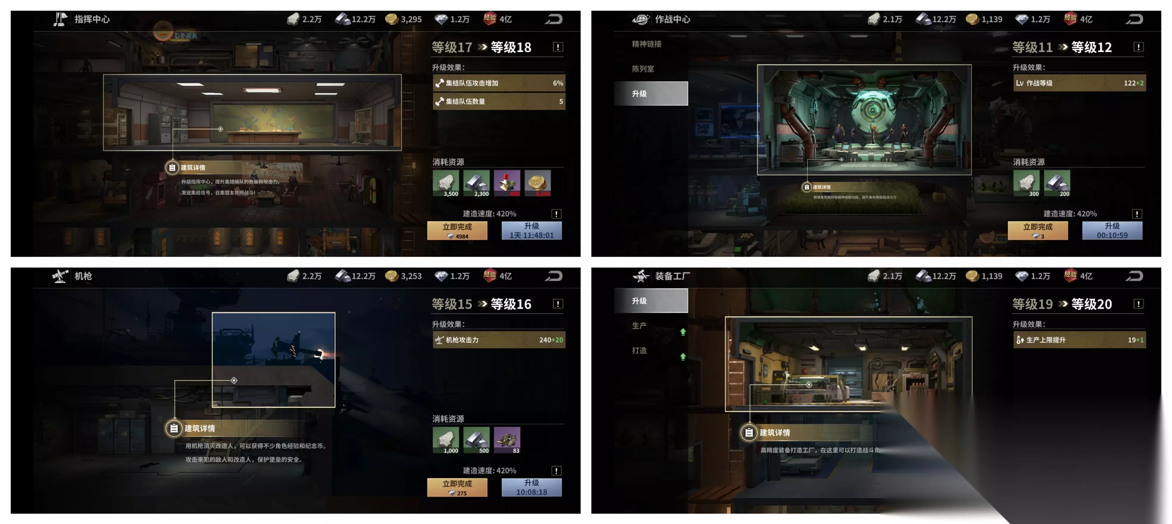 指挥中心,这个是集结用的,提升需要专门的材料,如果专业蹭车的话,可以不急着升级;作战中心,这个建筑在角色100级以前可以不考虑升级;机枪,升级需要专门的材料,获得难度大,提升收益小,随缘升级即可;装备工厂,是生产装备用的,升级是提升1次可生产材料的上限,不提高生产速度,升级的性价比较低,随意点几级即可。 此外,有两个建筑不能直接升级。直升机是满足他的六维要求,在交易界面升级,目前满级12级;雷达是通过做任务收集资料,收集够了自动升级的。 另外,关于科研第2队列开不开的问题,建议要开就尽早开,前期资源富余时尽快提升,后期就没必要开,因为限制你的往往是黎明币和电力,我现在就经常会因为资源问题耽误科研进度。如果开了的话,要尽量积攒煤和黎明币,后期会非常缺。 本期攻略适用于中氪以下玩家,仅供参考,咱们下期再见!
