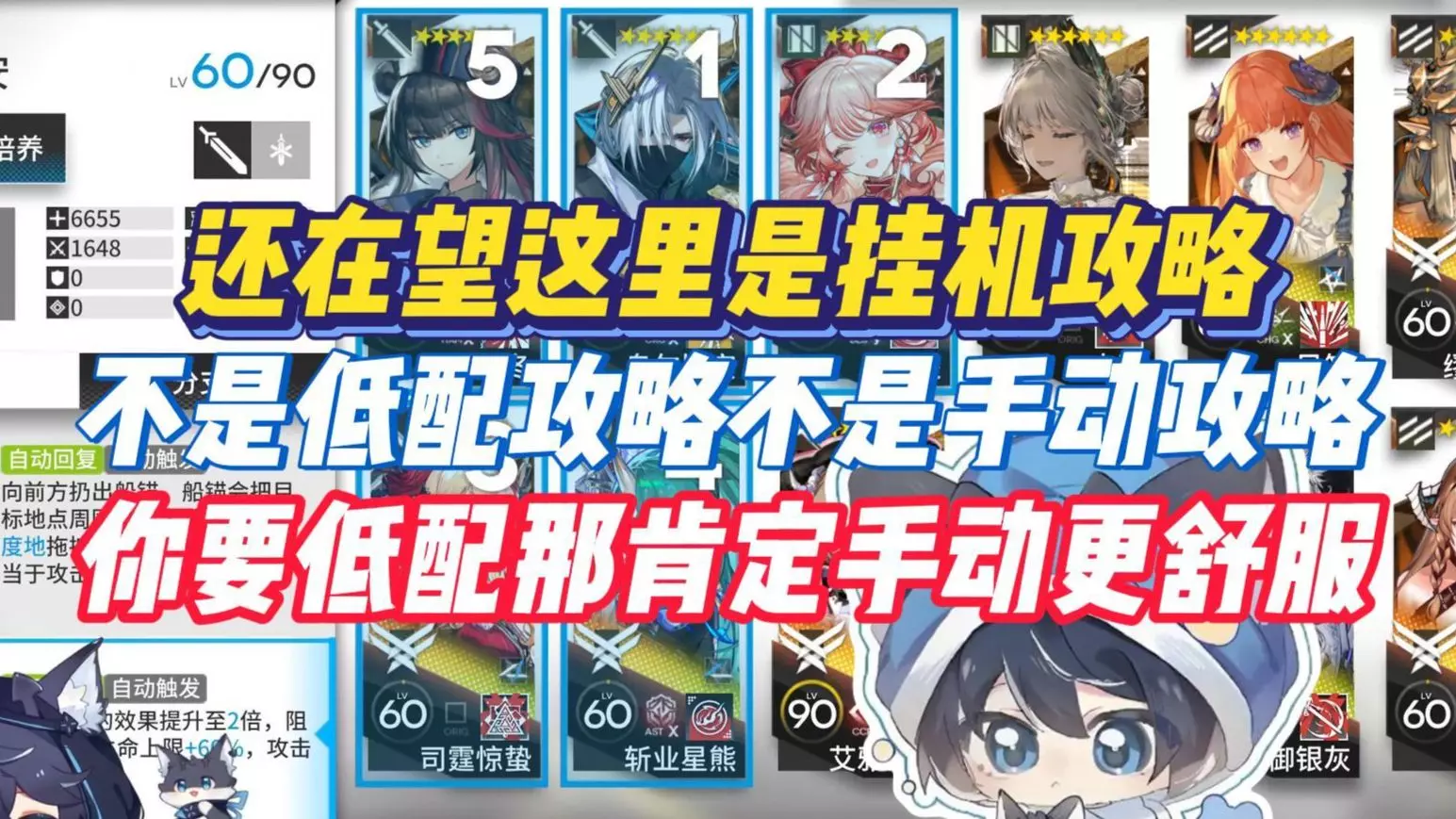 本视频为为懒人向挂机流攻略,不排斥手动开启的技能但少用,遇到难挂机的关卡会选择简单好抄的手动打法,非低配攻略。 视频里默认常用的干员:桃金娘1、德狗2、推王2、…