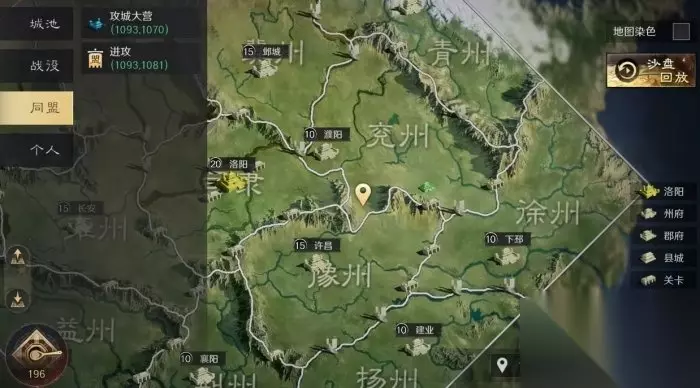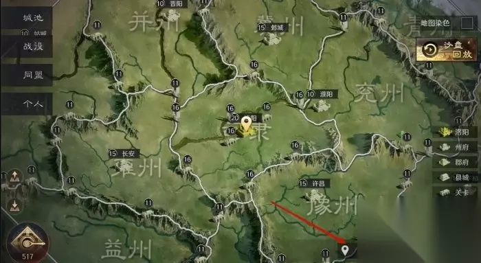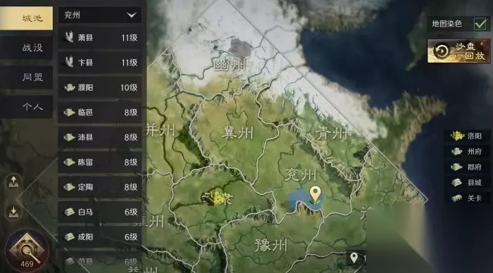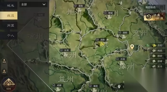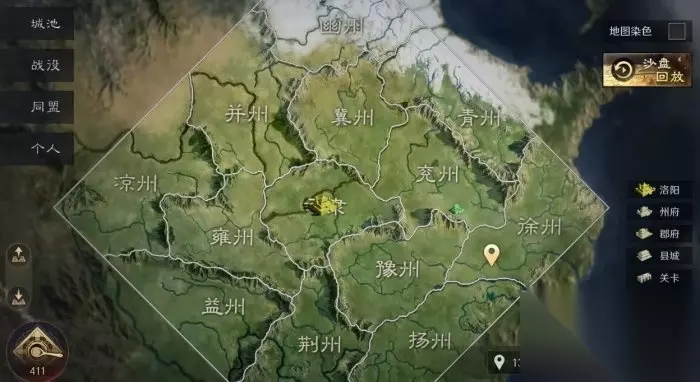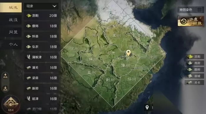冀州、豫州、雍州是三个资源州,资源州和司隶资源地等级较高,资源丰富,所以不能选作出生州。 二、大地图功能 1、城池 城池功能可以查看各州城池、码头和关口的位置、等级和占领情况。