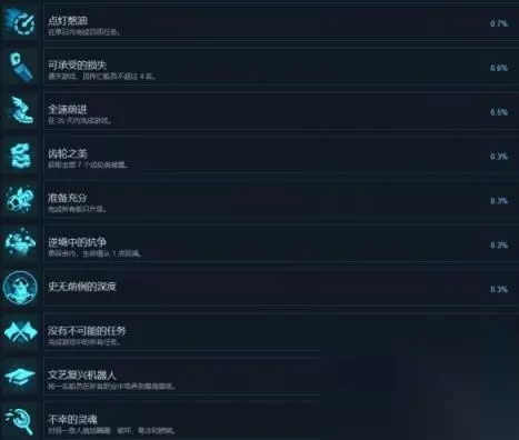 逆境中的抗争 单回合内,生命值从 1 点回满。 没有不可能的任务 完成游戏中的所有任务。 文艺复兴机器人 将一名船员在所有职业中培养到最高等级。 不幸的灵魂 对同一敌人施加蹒跚、破坏、寒冷和燃烧。 关于各项成就达成条件的描述为大家介绍完毕,还没开始开始游戏的玩家可以先大概的看看都有什么成就要收集。 攻略推荐:steam英文名称