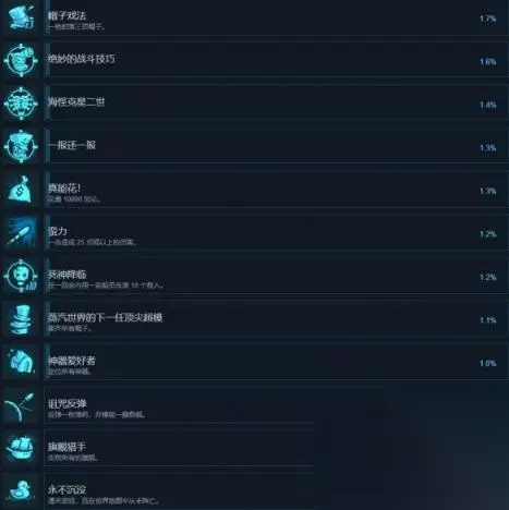 蛮力 一击造成 25 点或以上的伤害。 死神降临 在一回合内用一名船员击溃 10 个敌人。 蒸汽世界的下一任顶尖超模 集齐所有帽子。 神器爱好者 定位所有神器。 诅咒反弹 反弹一枚弹药,并摧毁一艘敌舰。 旗舰猎手 击败所有的旗舰。 永不沉没 通关游戏,且在世界地图中从未阵亡。 点灯熬油 在单日内完成四项任务。