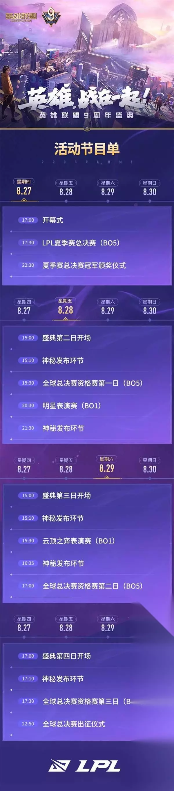 《英雄联盟》9周年盛典活动流程介绍 星期四8 月 27 日 17:00 开幕式 17:30 LPL夏季赛总决赛(BO5) 22: 30 夏季赛总决赛冠军颁奖仪式 星期五8 月 28 日 15:00 盛典第二日开场 15:10 神秘发布环节 15:30 全球总决赛资格赛第一日(BO5) 20:30 明星表演赛(BO1) 21:30 神秘发布环节 星期六8 月 29 日 15:00 盛典第三日开场 15:10 神秘发布环节 15:30 云顶之弈表演赛(BO1) 16:35 神秘发布环节 17:00 全球总决赛资格赛第二日(BO5) 星期日8 月 30 日 17:00 盛典第四日开场 17:10 神秘发布环节 17:30 全球总决赛资格赛第三日(BO5) 22:50 全球总决赛出征仪式