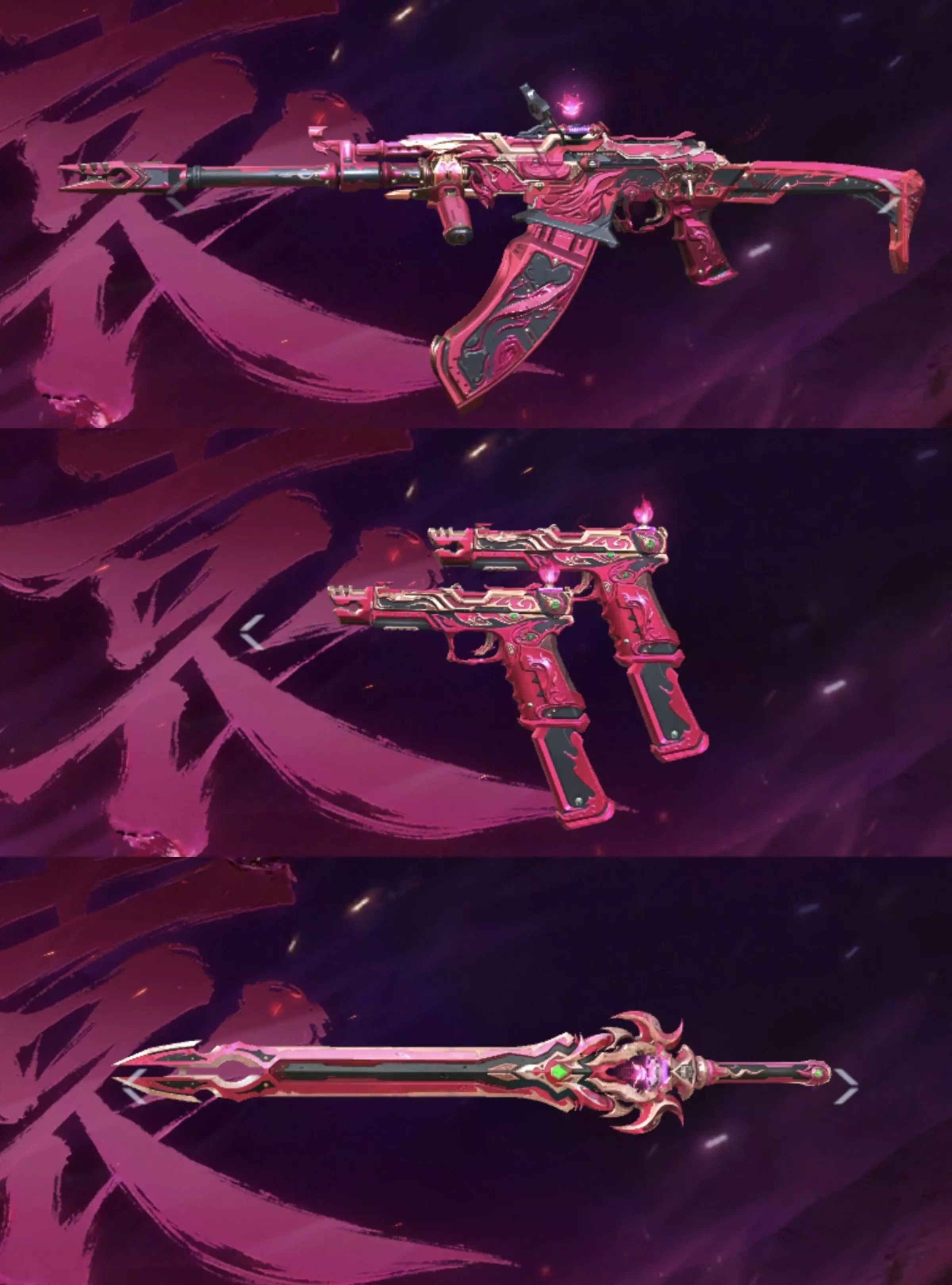 本初套装全系采用玫瑰红作为武器的基础装甲颜色,犹如火焰在燃烧,将武器本身赋予魔法之力,既炽热又神秘,枪身上古老的铭纹在跃动的火光中若隐若现,每一道斑驳的刻痕都是时光镌刻的印记,在明灭的火光中流转着神秘的光晕,既典雅又非凡。