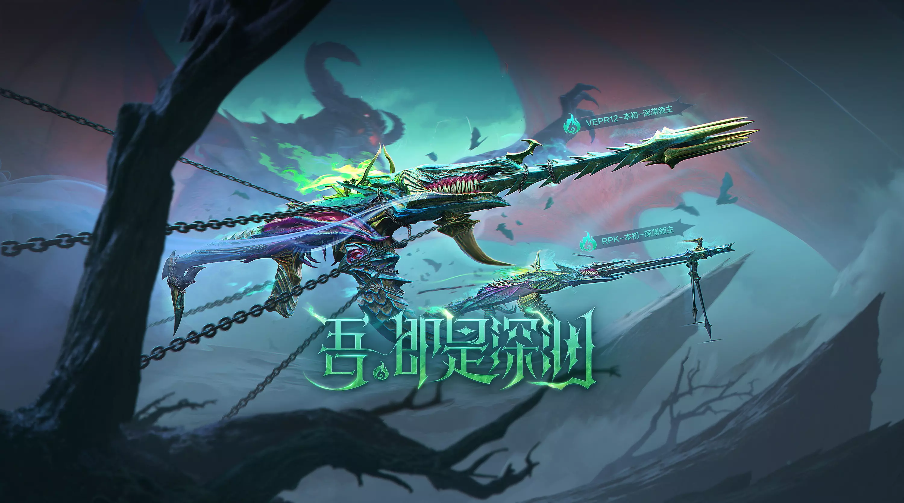VEPR12-本初-深渊领主整体以暗绿色为主基调,带有部分暗紫色装饰,枪身缠绕着猩红色能量脉络,如同深渊魔神的血管,枪管处镶嵌三枚倒刺状紫水晶,开火时会迸发暗影流光,握把覆盖着鳞甲纹路,枪托末端悬浮着两枚旋转的邪眼符文,整体散发着令人战栗的深渊压迫感。