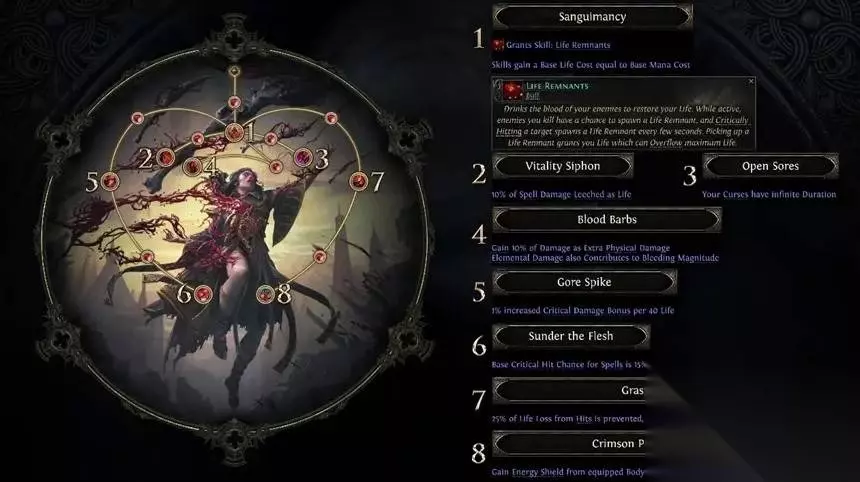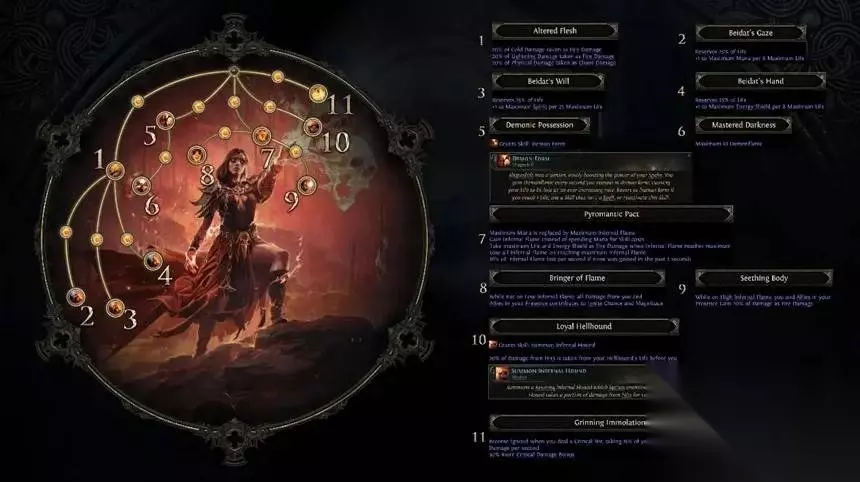这个升华技能包括在战斗中持续掉落生命球,对于手残党来说是福音,但是你本来释放技能的魔力,就会转变成消耗生命。 你还可以选择10%的生命吸取或者诅咒,持续时间无限这些不同的升华路线,又或者让元素伤害获得流血效果。 除此之外,血法师的升华点数也大幅提升,暴击爆伤, 最后还能把受到25%的瞬间伤害转换成缓慢流失伤害,还能根据胸甲能量护盾值来增加生命值。 如果你是喜欢又能召唤又能充血变硬的玩家,就选择血法师。 02 狱术士