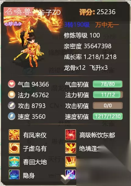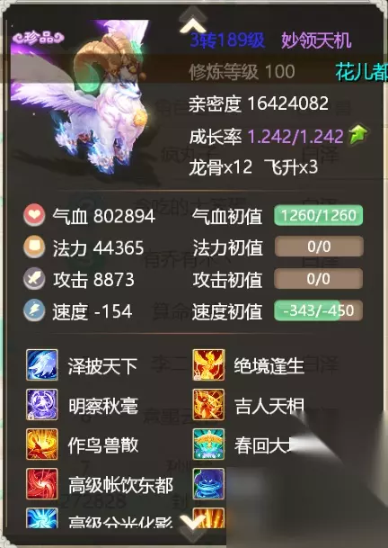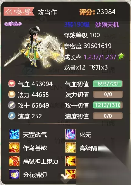 年 年在大话手游中可以说是不折不扣的第一敏宠,这一神兽向来都是身份和实力的象征。无论是在日常过副本还是赛事PK中,我们都经常能看见年首发的身影。因为速度初值高达1300,稳坐于第一敏宠。使得年汇集了玩家万千宠爱于一身,绝境年,化无年,几乎成为了一头年的标配。年最大的缺点就是气血初值极低,这意味着在它的身上需要适当在根骨上加点,保证年的生存情况。