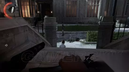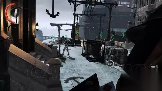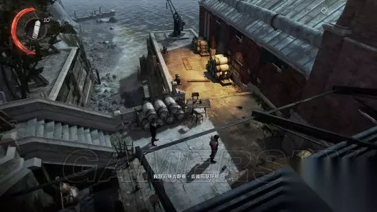 离开密道,艾蜜丽通过屋顶逐步到达地面,途中会碰到一个敌人。可以练习一下坠落式狙击。具体操作:从上方降落到敌人头上,可以避免因坠落受伤。在落地前按下鼠标左键可执行坠落击杀;按ctrl可执行非致命狙击,使敌人不省人事。